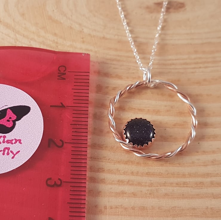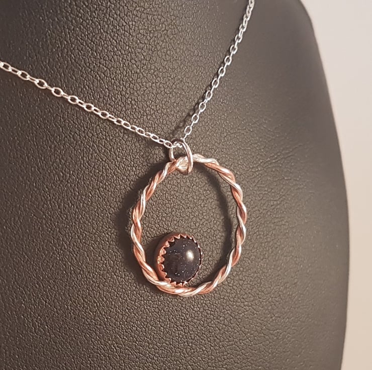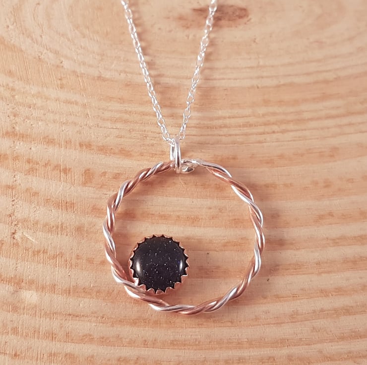 An unusual and delicate necklace from sterling silver and copper, with a sparkly Blue Goldstone cabochon. This delicate necklace has been hand made from sterling silver and copper. Silver and copper wire have been twisted together to contrast the two colours. It has then been soldered into a circle. A copper cabochon setting has then been made and soldered on at an angle in the circle. A loop has been soldered to the top for the chain. An 8mm Blue Goldstone cabochon has then been set, as the sparkle in the stone is caused by copper flecks.
