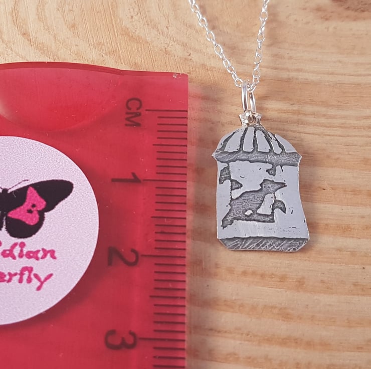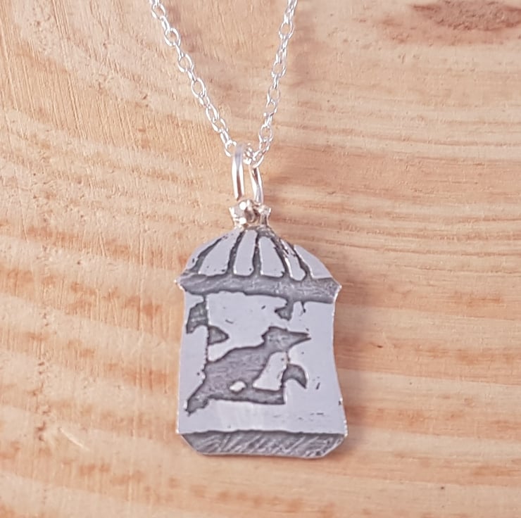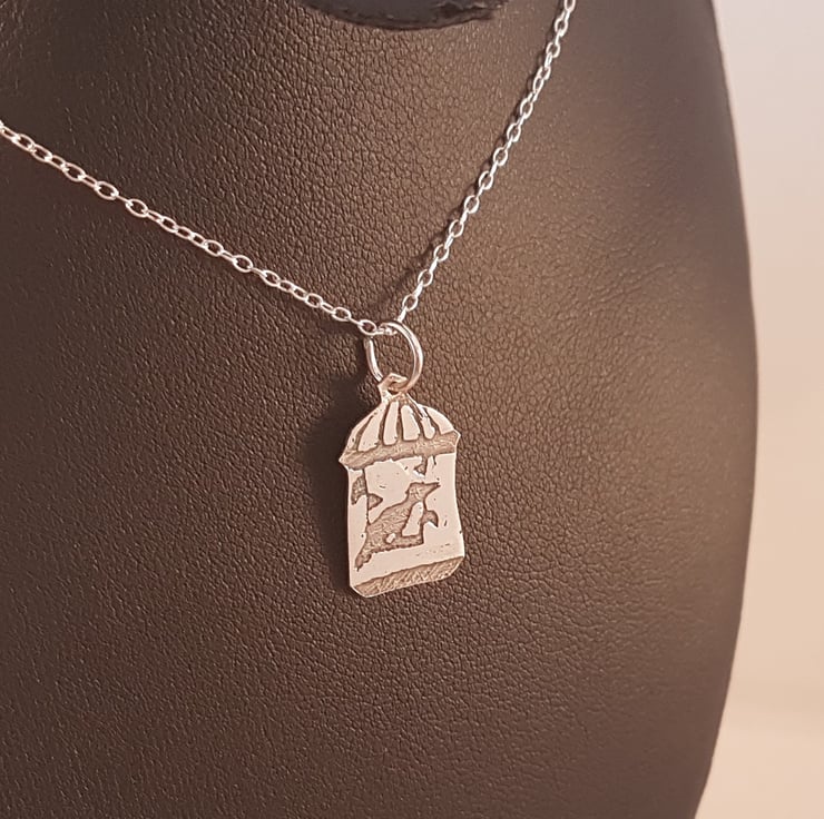 A dainty etched silver necklace of a birdcage, ideal for animal lovers. This pretty necklace has been hand made from a sheet of sterling silver. A simple bird cage shape has been hand cut from a sheet of silver. It has then been hand drawn and negatively etched with a birdcage. A loop has been added to the top, and then the necklace has been oxidised to blacken the design.