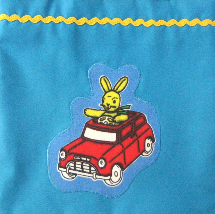 Child's tote bag with vintage retro applique of a rabbit driving a car.