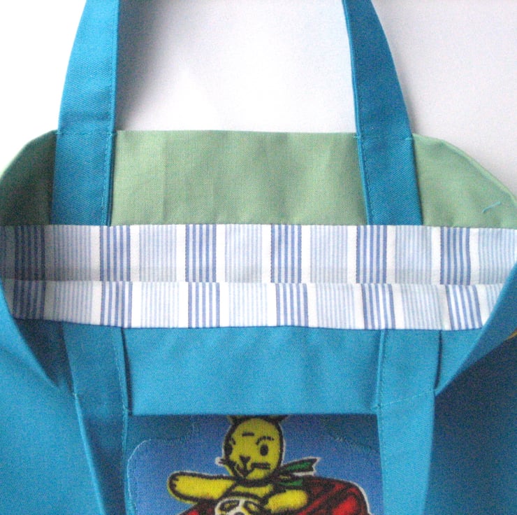 This cute retro tote bag has been made from cotton fabrics in blue and green, decorated with bright yellow rickrack and an applique made from a vintage 70s Dean's cloth book.