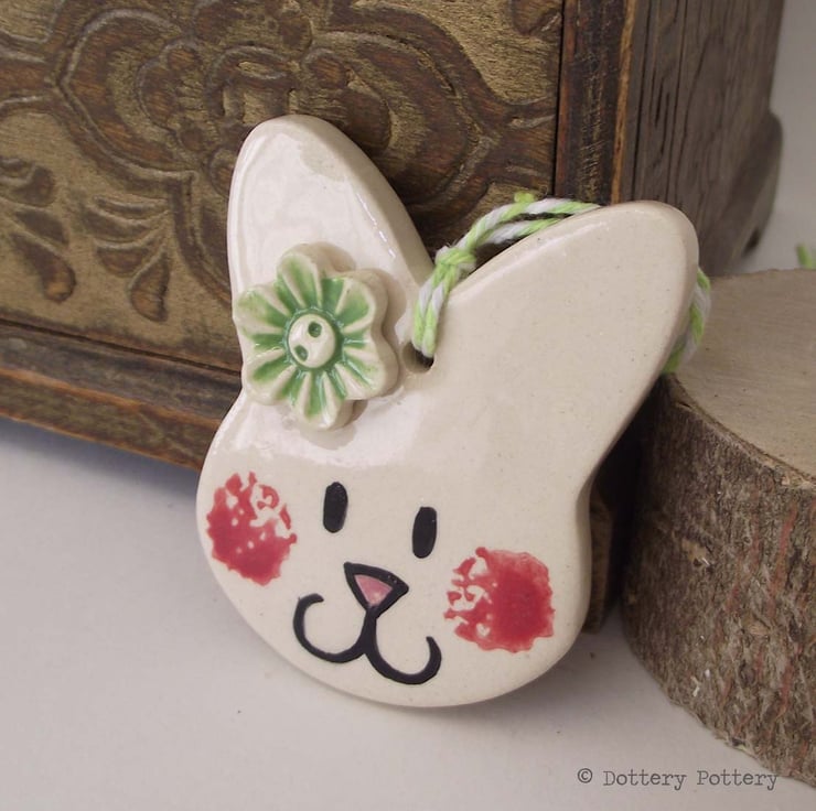 This pottery bunny decoration is made from white earthenware clay and decorated with a little flower,