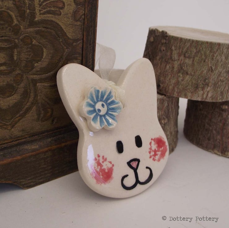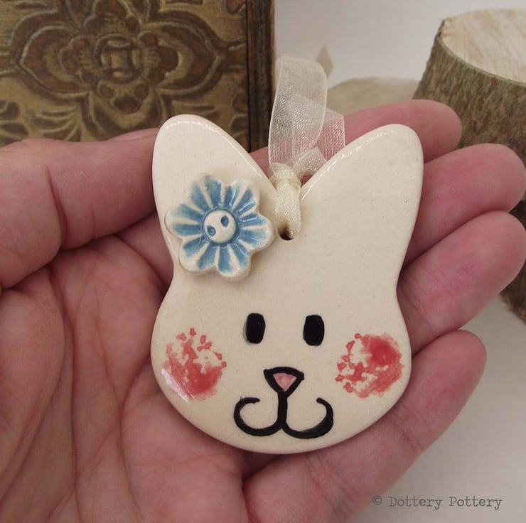 This pottery bunny decoration is made from white earthenware clay and decorated with a little flower,