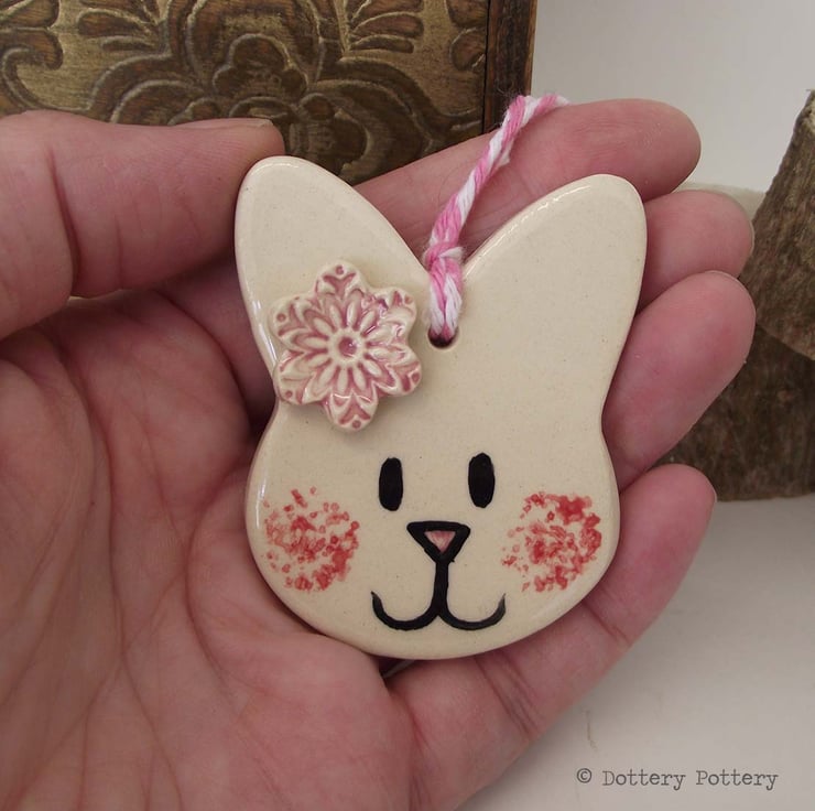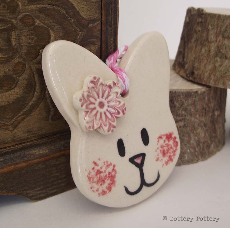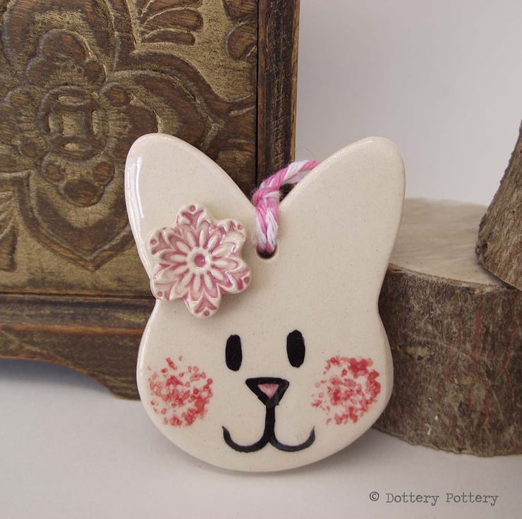 This pottery bunny decoration is made from white earthenware clay and decorated with a little flower,