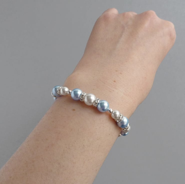 The pairing of the lustrous pearls with the glittering crystals makes this light blue pearl bracelet ideal for a bride or her bridesmaids. Created using pale blue and white glass pearls, round silver beads and bands of shimmering crystals