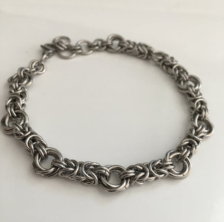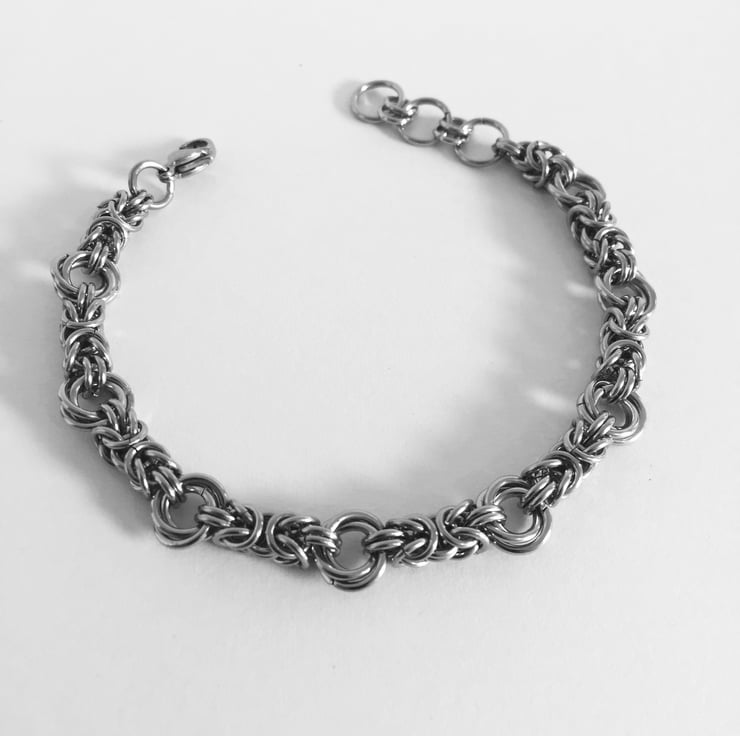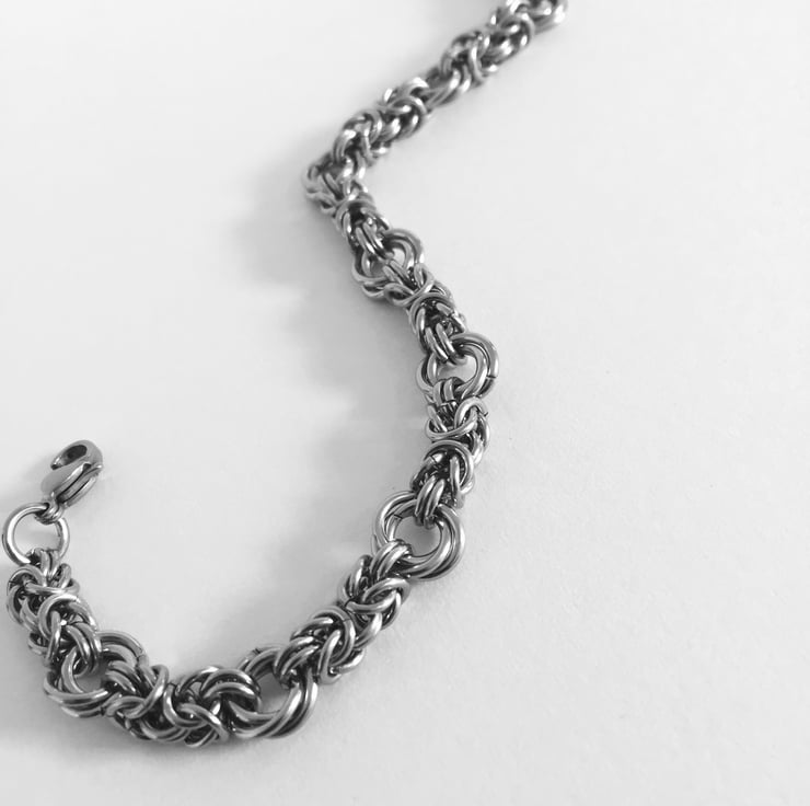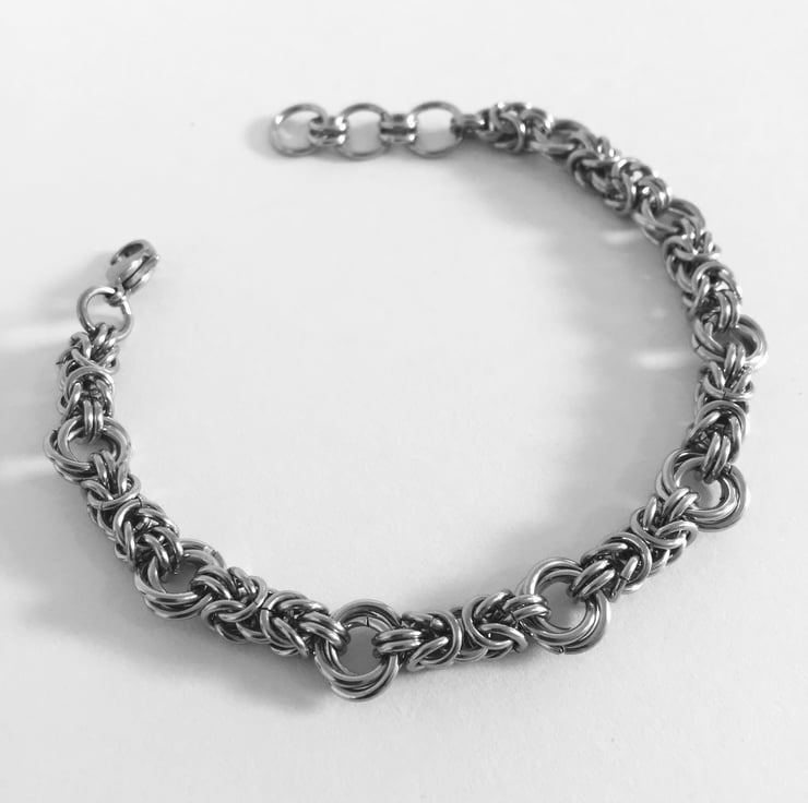The byzantine units are 4mm wide, and each bracelet is fitted with a sturdy stainless steel trigger clasp and extending rings.