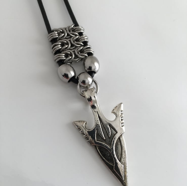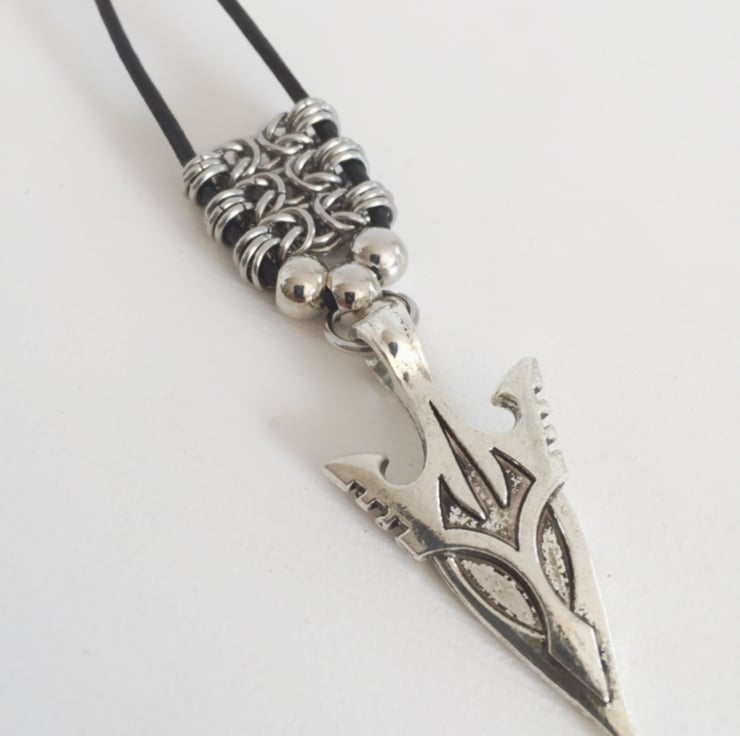 For added impact, there is the addition of three byzantine units handmade in stainless steel. Three silver barrel beads completes the look. A great unique piece for men and women