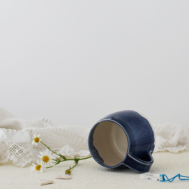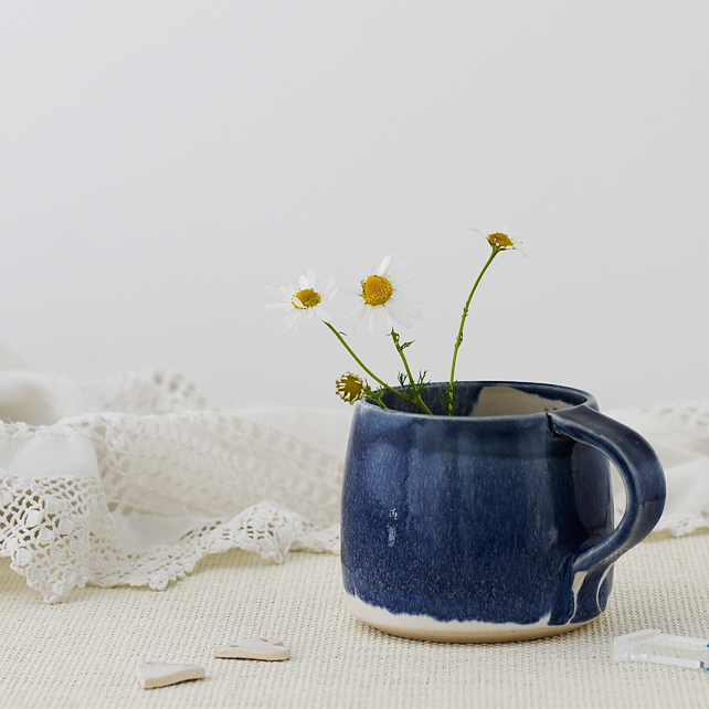 With its quiet understated design, this mug stands out thanks to its sleek shape and lovely shades of blue and white. I applied two glazes, creamy white to begin with both inside and out, followed by a coat of royal blue which seeped towards the inside in the heat of the kiln. The delicate pattern around the outside formed in the kiln as blue and white combined.