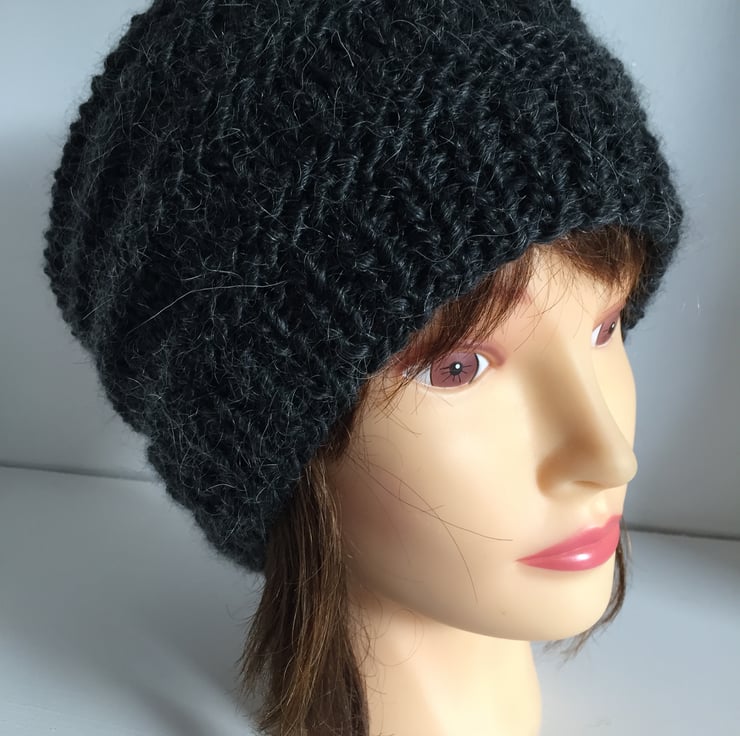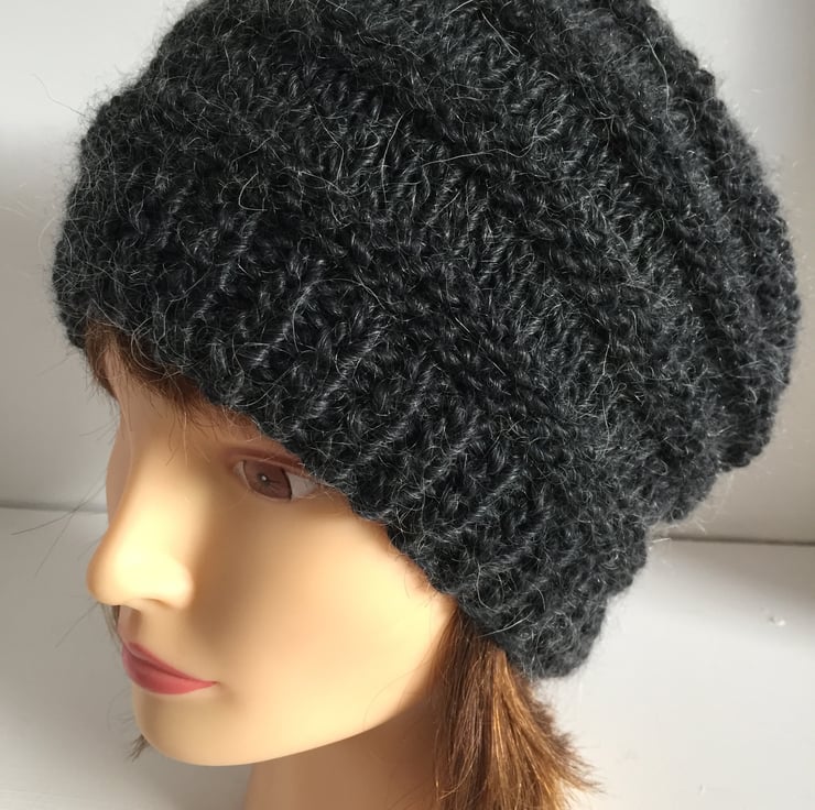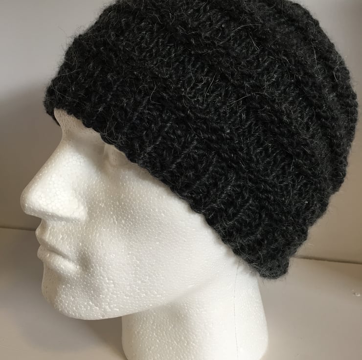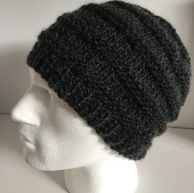 This dark grey autumn and winter knitted hat features deep ribbed edging, and a mixture of knit and purl stitches to give added appeal.