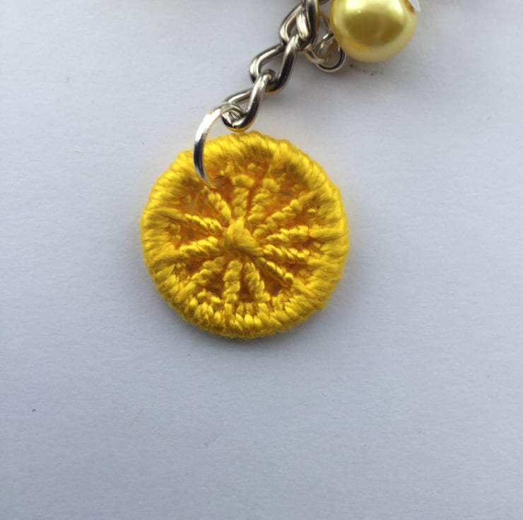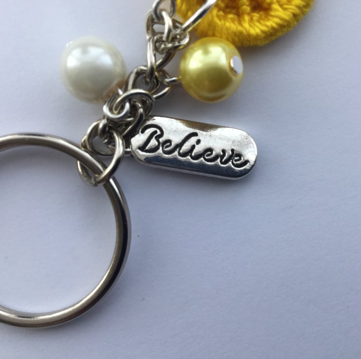 It is hanging from a keychain together with 2 pearl beads, white metal charm which reads 'Believe' and a sweet little beaded guardian angel in primrose yellow and white.
