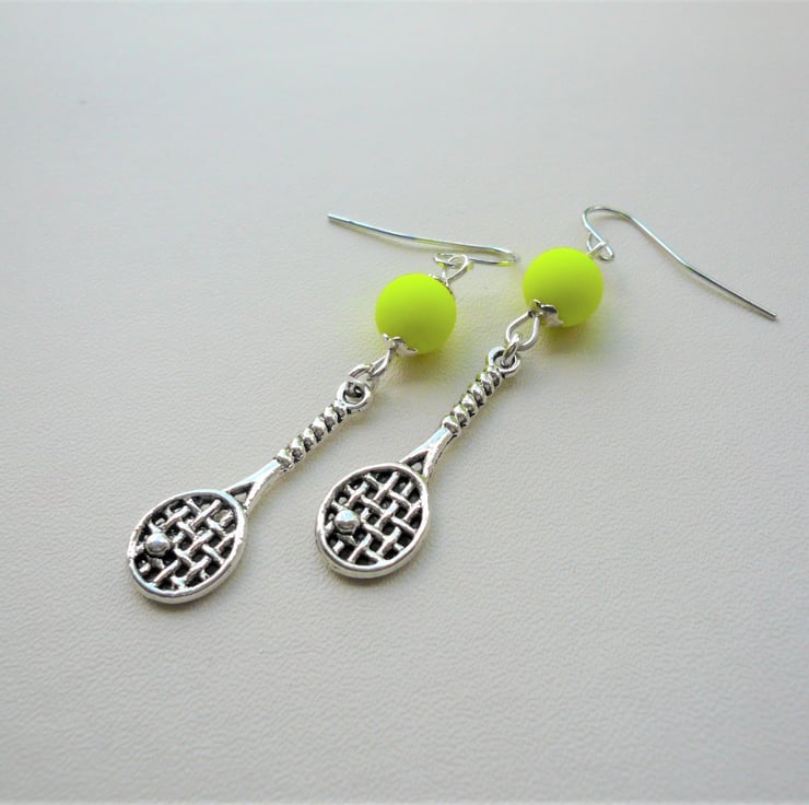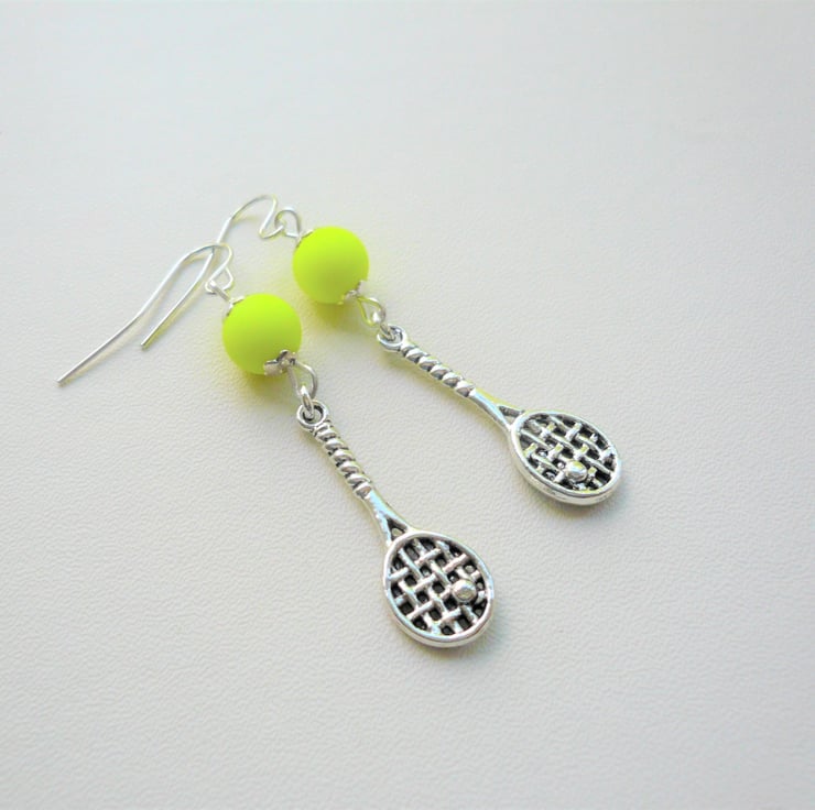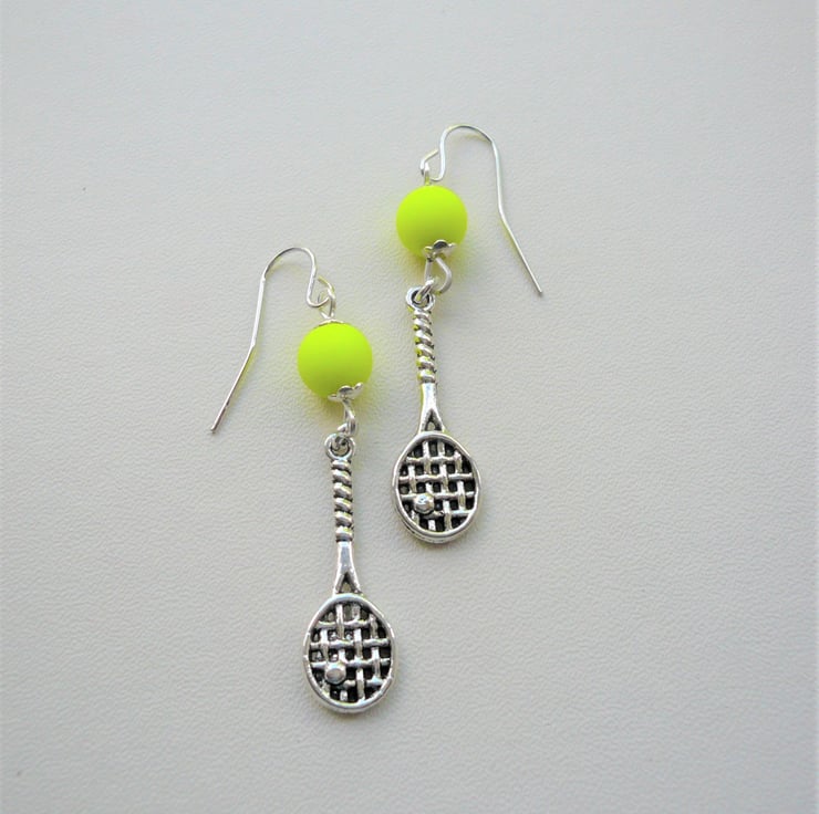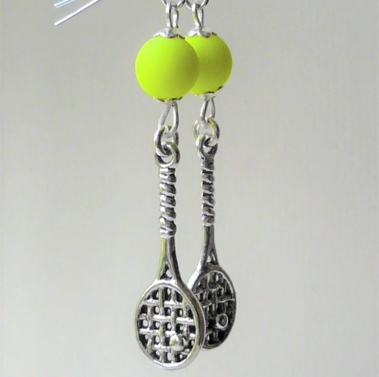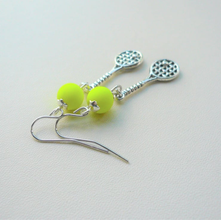 Tennis themed dangle earrings made up of 8mm round neon yellow resin matt beads teamed with Tibetan silver tennis racket charms and hung from silver plated shepherds hook ear hooks. Total length incl hook is approx 5.5cm.