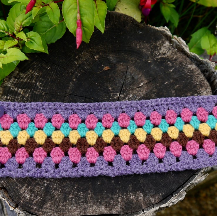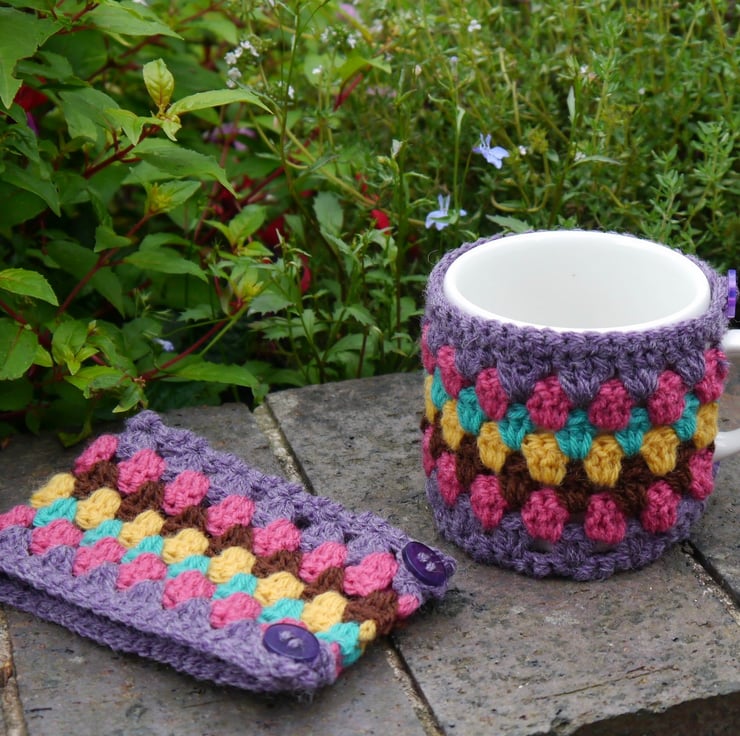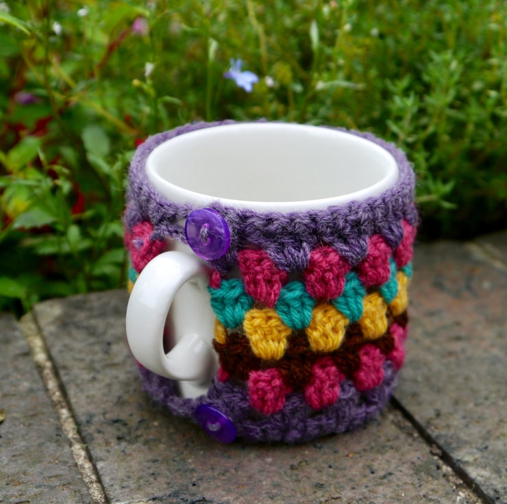 I have designed this retro granny stripe mug cosy to keep your tea or coffee nice and warm. It has two lovely purple buttons for easy fastening into two crochet loops. It measures approx 8cm in height and will fit a standard 26cm diameter mug or cup.