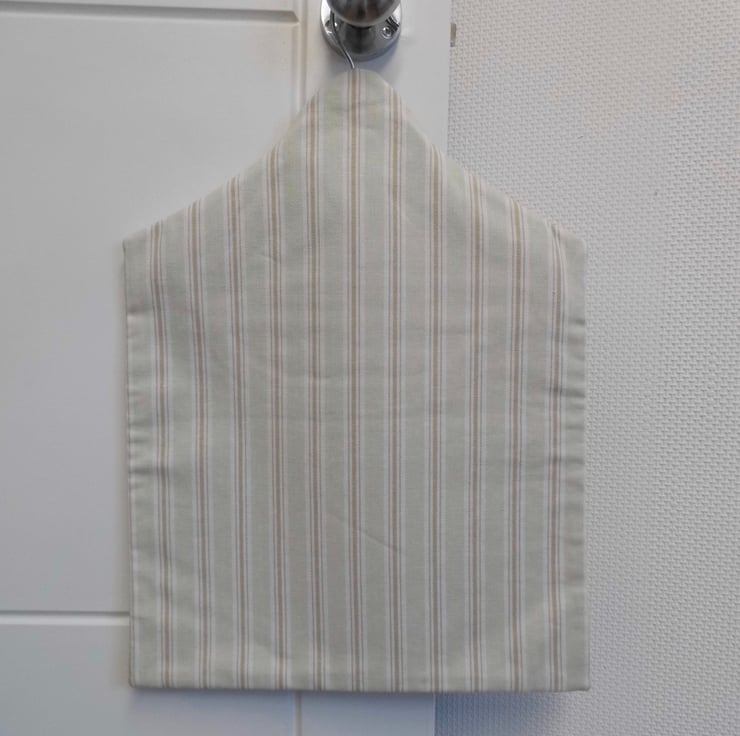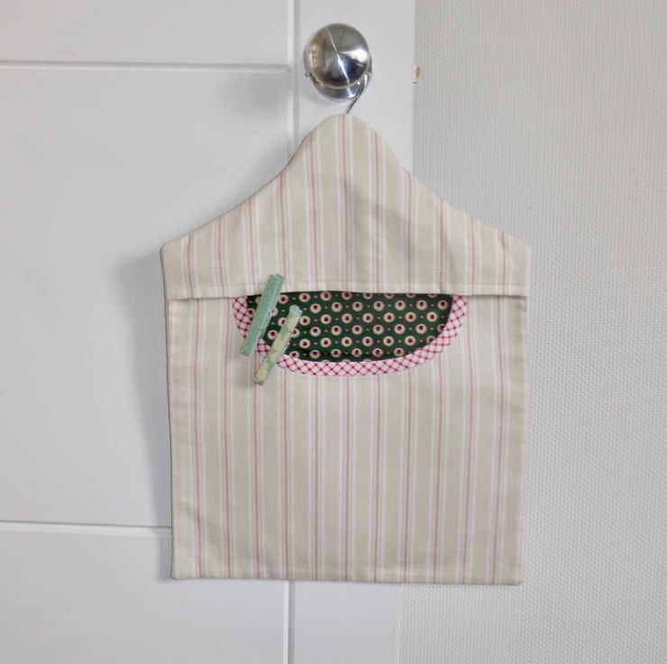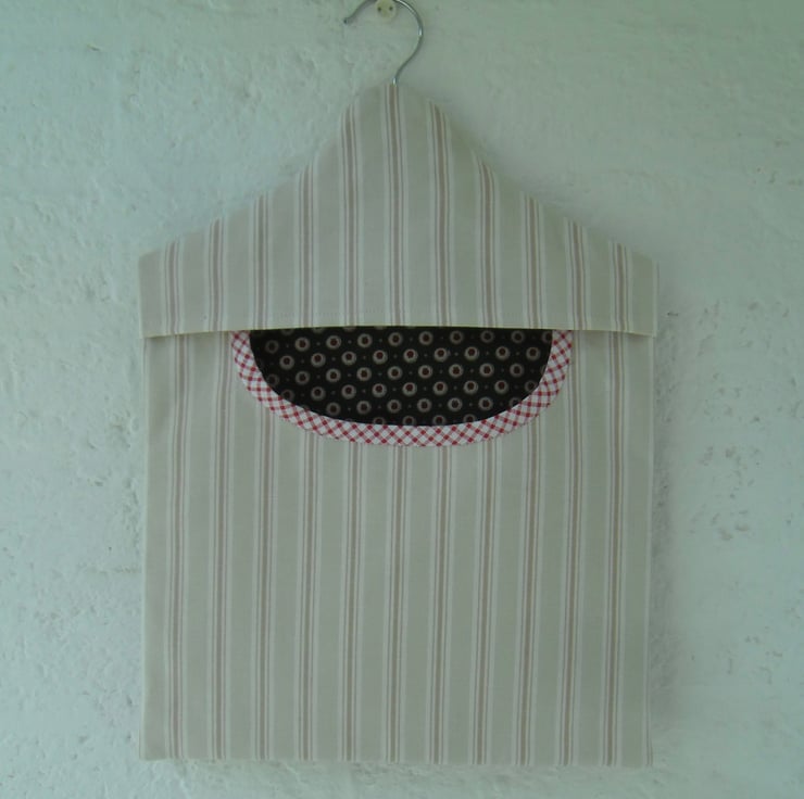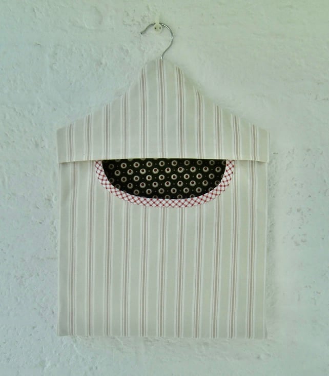 I have made bias binding from red and white checked cotton fabric to bind the opening, I think this gives it a bit of country style. On a wooden coat hanger so it can hang on your line, in your kitchen or laundry room.