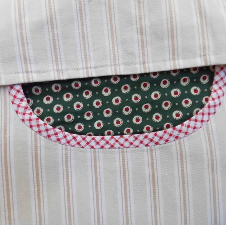 A fully lined peg bag carefully made using a sturdy canvas style fabric with cream, beige and white stripes. The back is lined with a dark green quilting cotton printed with tiny apples and stars and you can see this through the opening. The front is lined with beige cotton fabric.