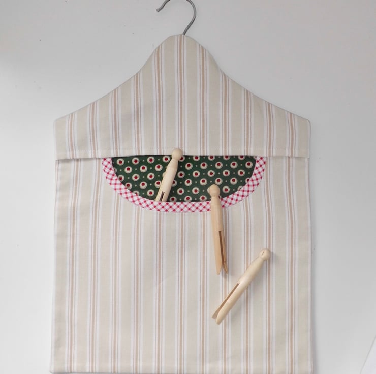 Peg bag in striped canvas fabric with dark green lining and red trim.