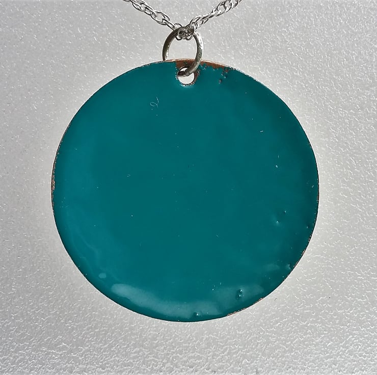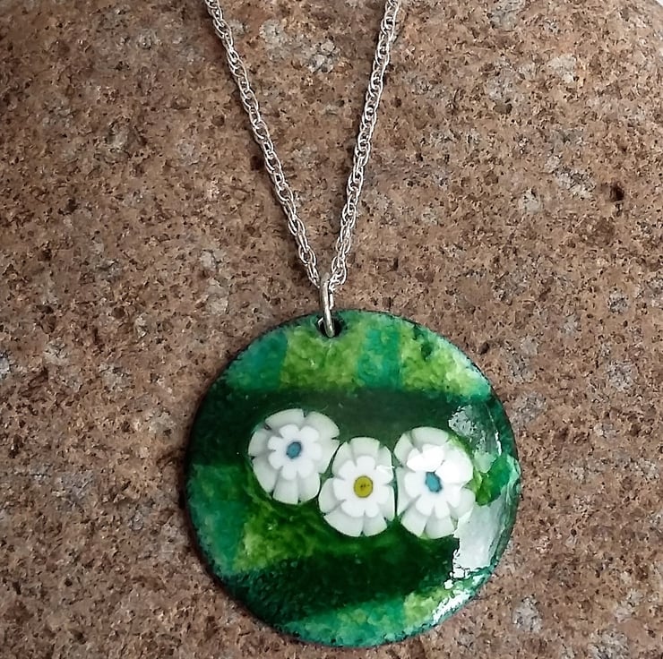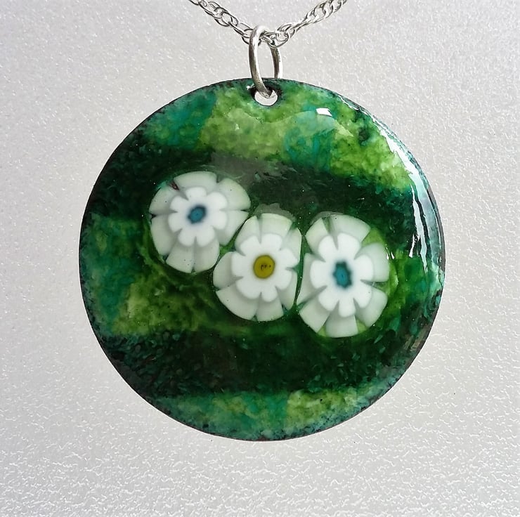 Round enamelled copper pendant in shades of green with three white millefiori. The pendant has been kiln-fired and measures approximately 30mm in diameter. The back has been finished in glossy turquoise enamel. It comes complete with an 18” sterling silver rope chain with a soldered sterling silver jump ring and is supplied with a little organza pouch. POSTAGE IS FREE!