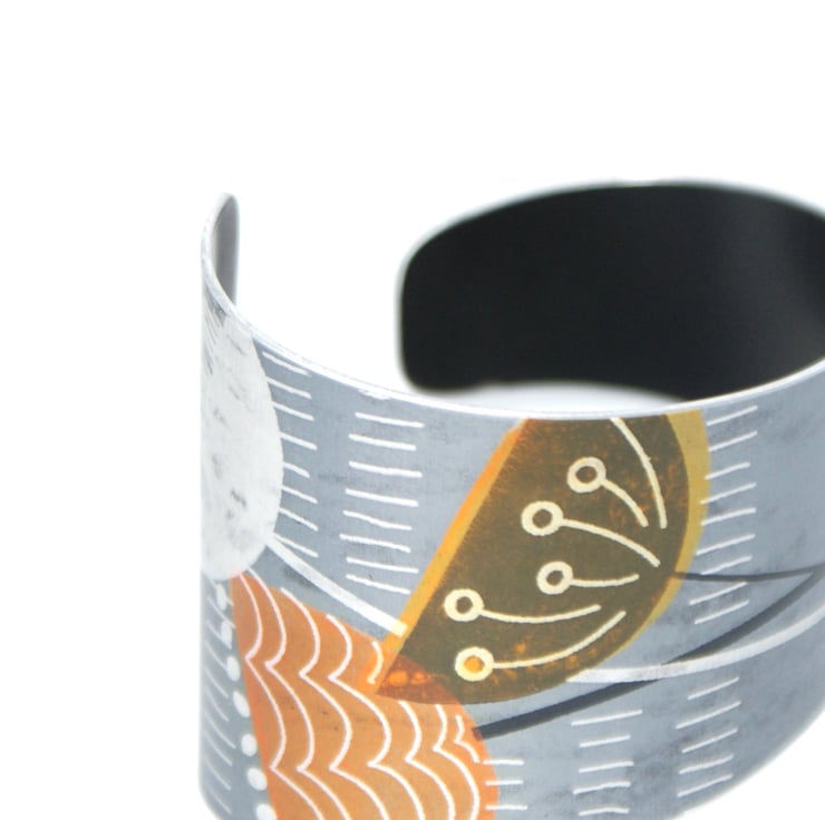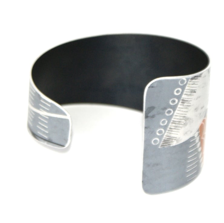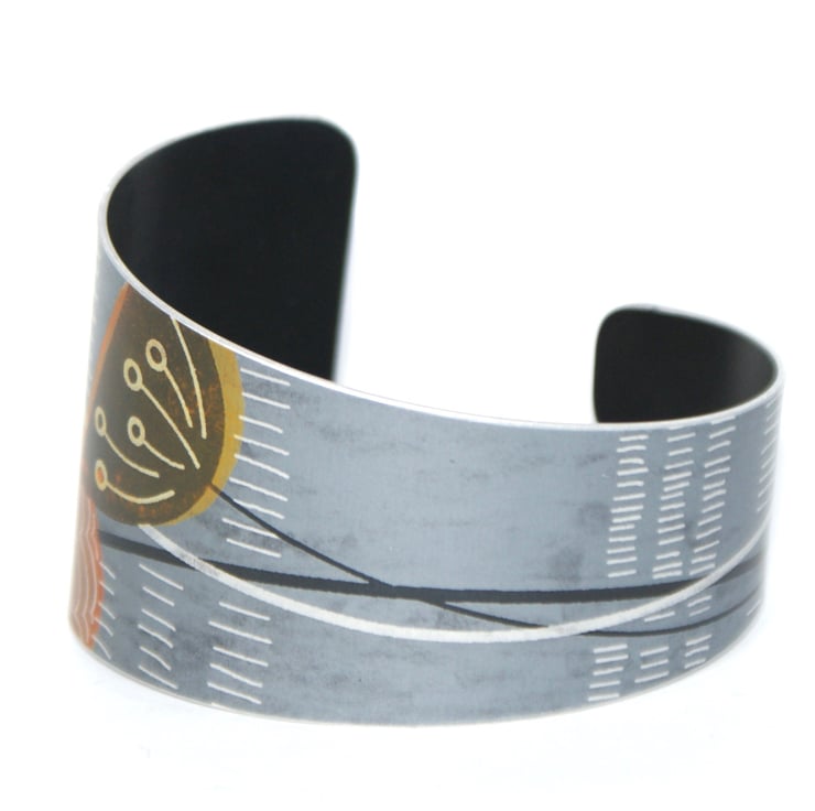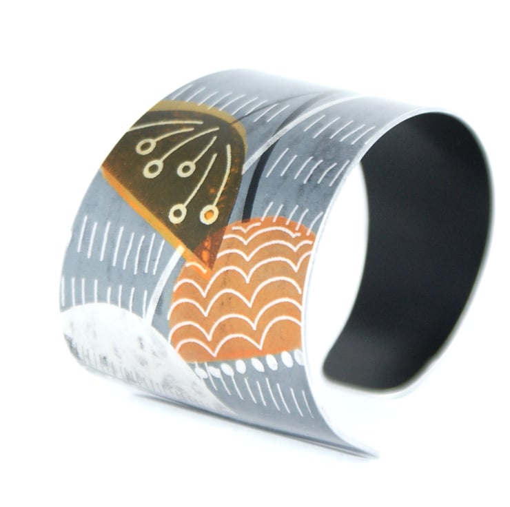 A gorgeous scandi inspired cuff bracelet crafted from anodised aluminium. The pattern originated from a sketch that I transferred to my computer to create resists. These are applied to the metal and then the piece is hand printed and immersion dyed to create the layers of colour. It is then sealed and finished using traditional metalworking ttechniques. The cuff is wide at one end (approx 5cm) and narrow at the other (approx 2cm) creating a sculptural form that looks great on and off.