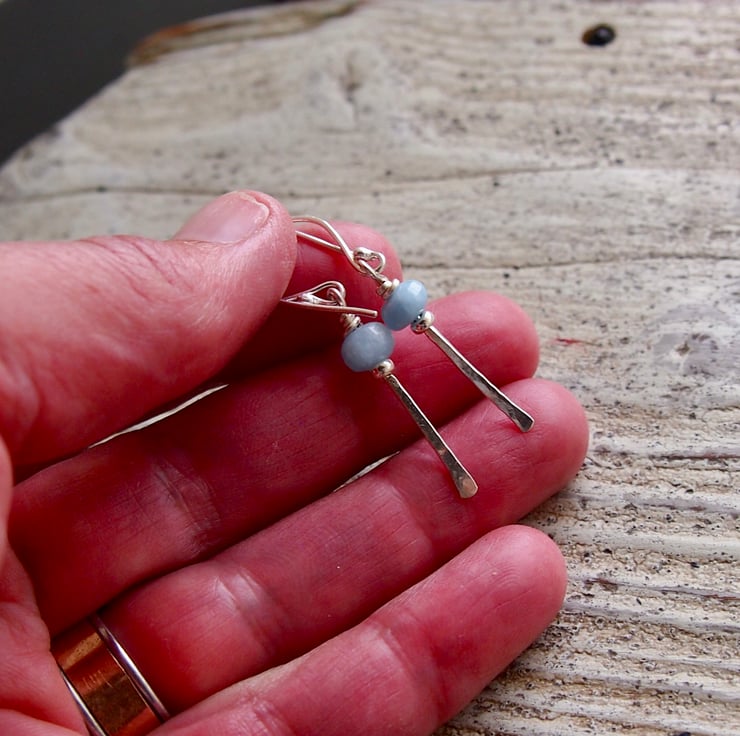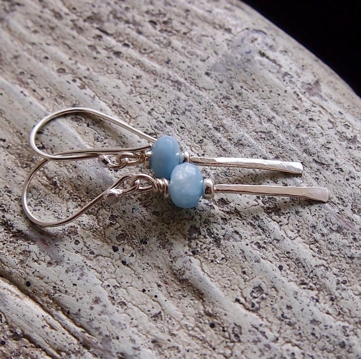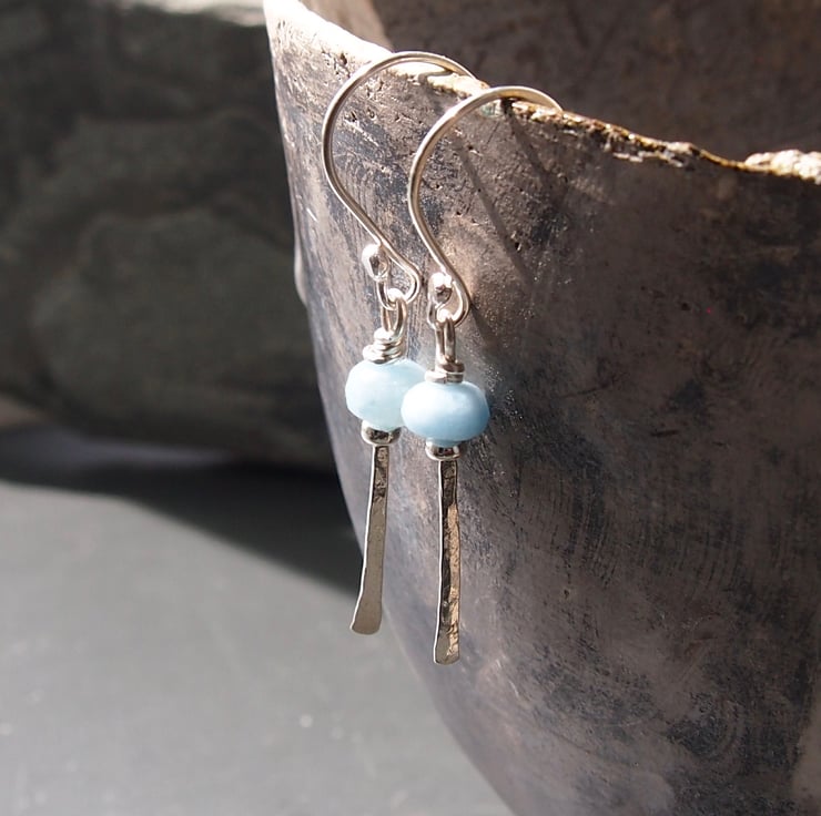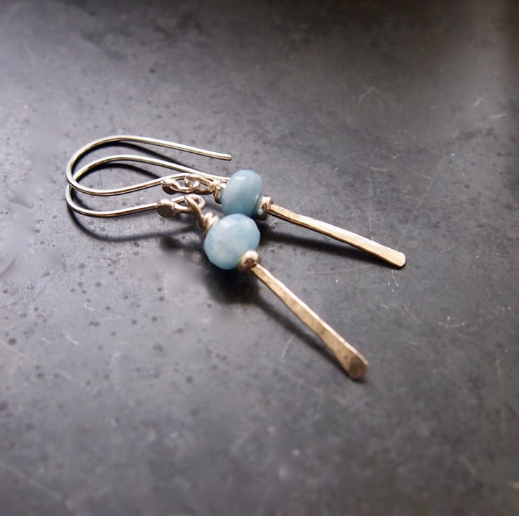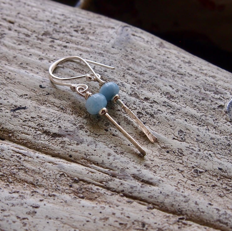These pretty earrings have a forged and beaten sterling silver tail topped with a pale blue facetted aquamarine bead and a little silver bead.