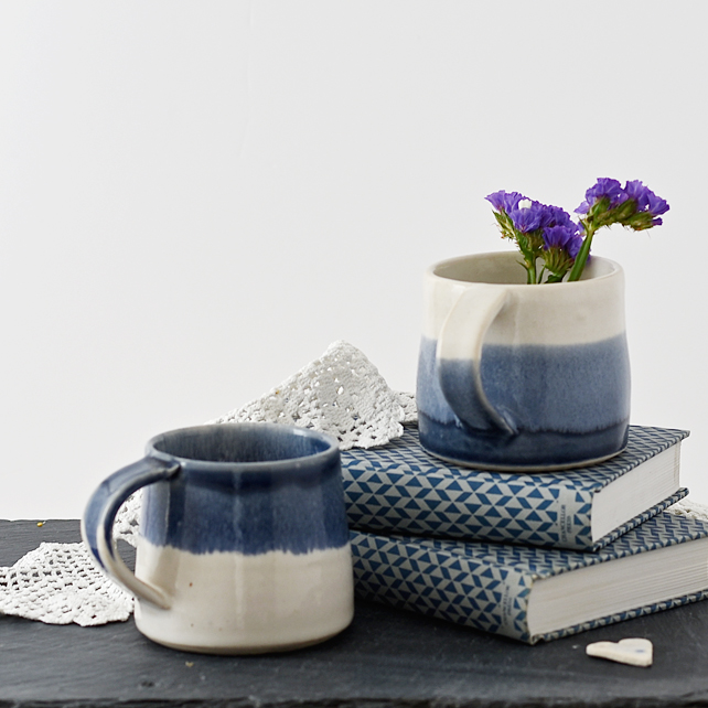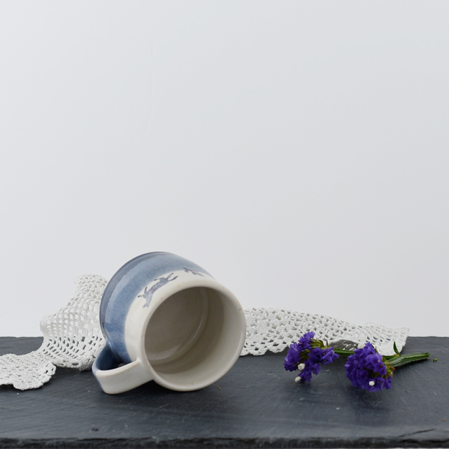 The cup was hand-thrown of a lovely creamy white stoneware clay and glazed in shades of blue and cream. The image - you'll also find it on a full-size mug - is fused deep into the glaze and will not fade over time.