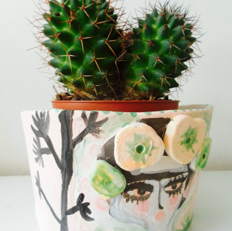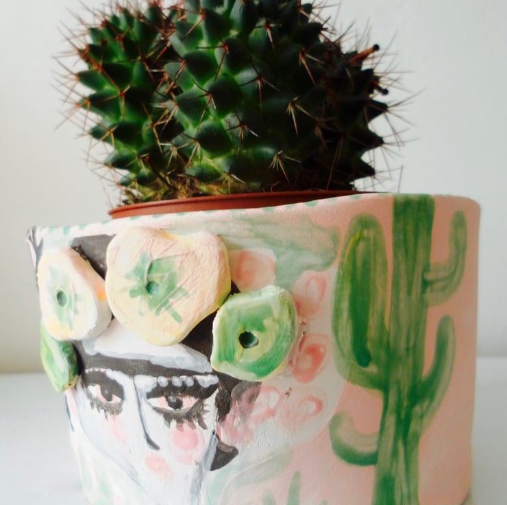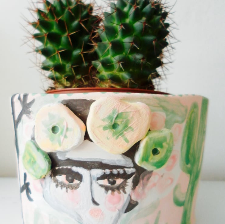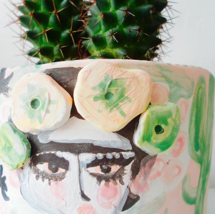 A cute illustrated stoneware Frida Kahlo pot for your cactus or succulents.