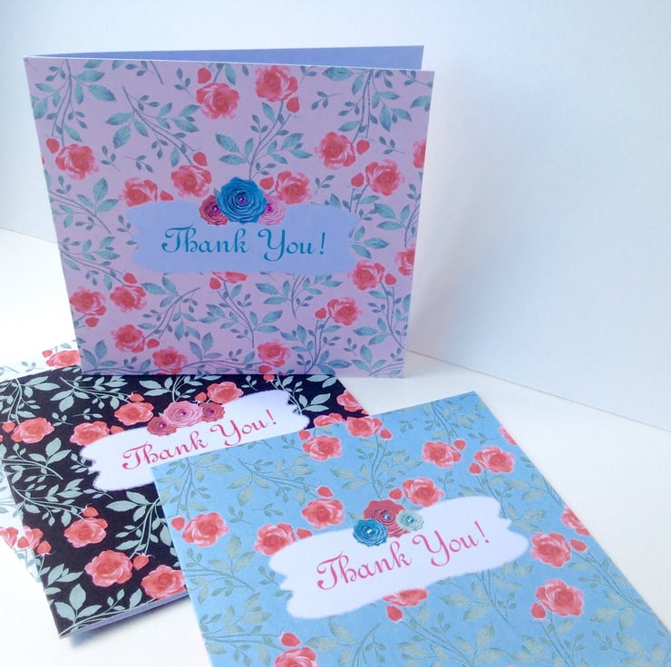 The listing is for a pack of four thank you greeting cards,each showing a different colour scheme of a vintage rose print.