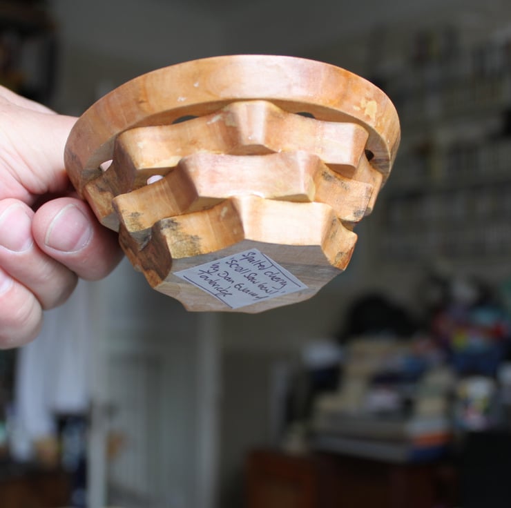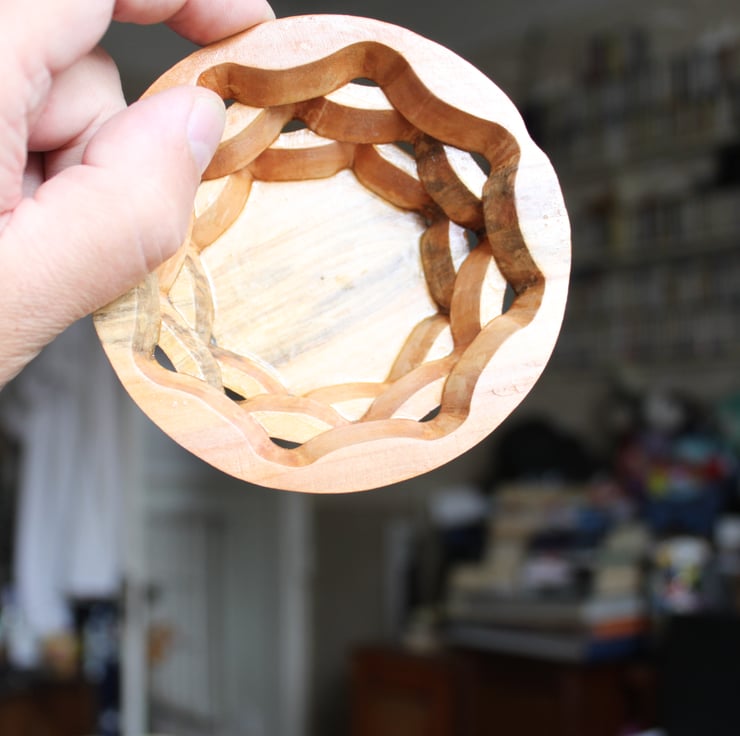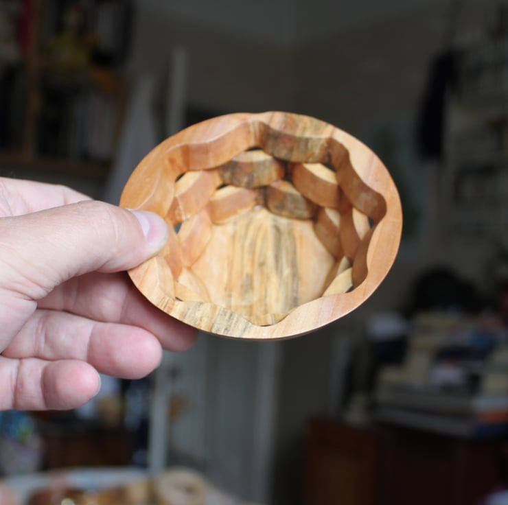 An exploration of a technique which uses a flat piece of timber, then by cutting out on a scroll saw with the base set at an angle and re-gluing the segments a bowl is made with matching grain and very little waste of timber. It is quite time consuming, but good fun and it allows some lovely little bowls to be made that are unique and rather dainty.