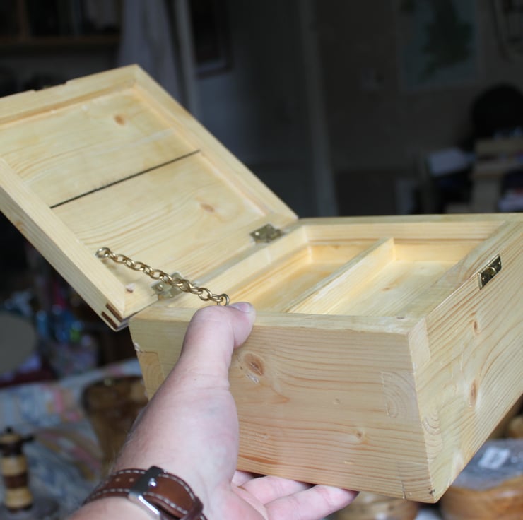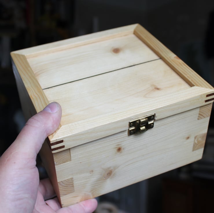 185mm x 185mm x 115 mm High. 841 grams weight. A chunky traditional pine jewellery box that will last for years. A thin ebony strip in the lid keeps the minimalist feel. The chunky comb joints add to the style. A lift out tray allows easy access to the divided areas underneath. A practical, no nonsense box that will give years of good service.
