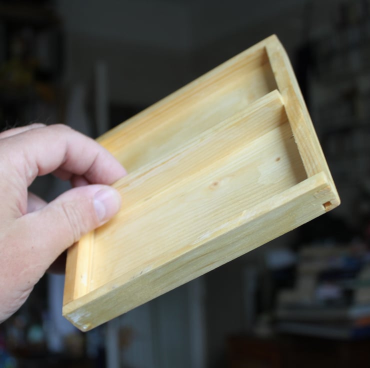 I was just making a box with timber I had to hand. I love Pine, the grain, the smell: and it is a locally grown timber that I think is much maligned. To me the main points were the ebony strip in the lid and the keys to reinforce the mitres on the lid; for which I had just made a special jig to allow me to use my router table to make the slots to insert the hard wood keys. A light coat of melamine lacquer, which Chestnut products say is safe for toys, with a bees wax finish over the top to add a nice lustre. Brass hinges, chain and catch add to the traditional, minimalist feel, as does the plywood base.