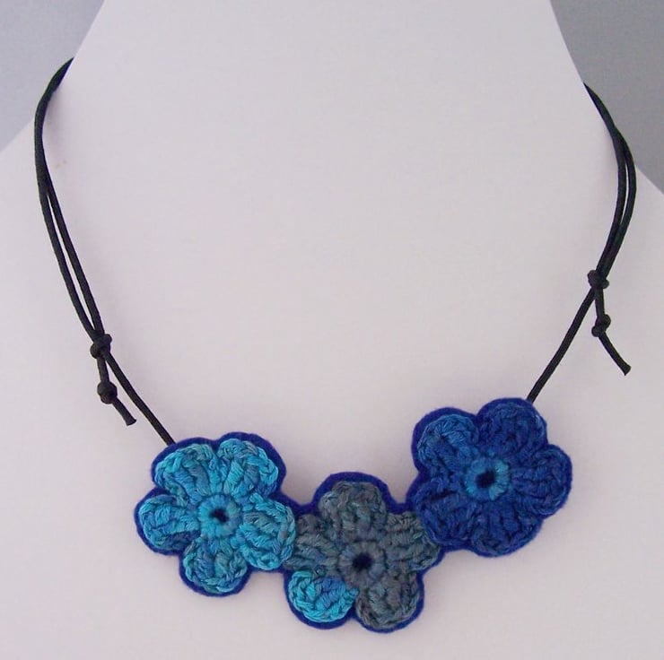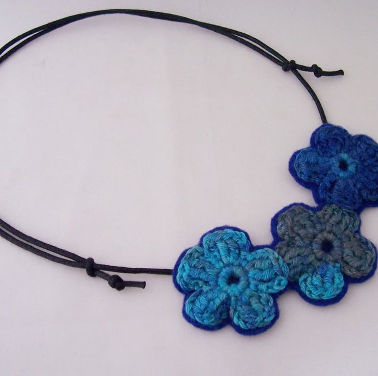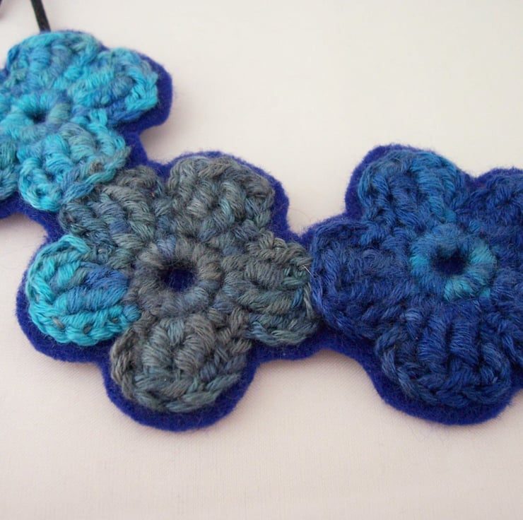 Three crochet flowers in varigated blue yarn, mounted on a mid blue wool felt.