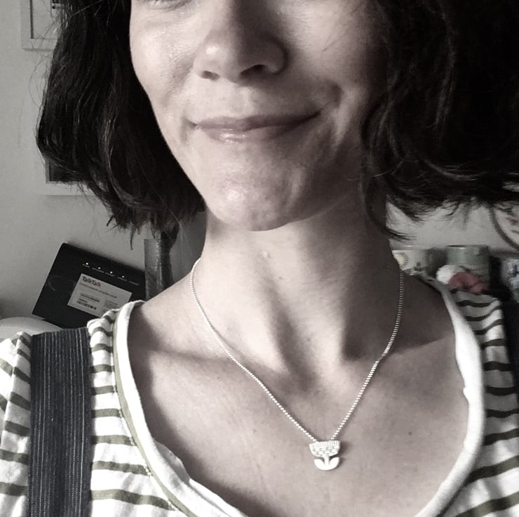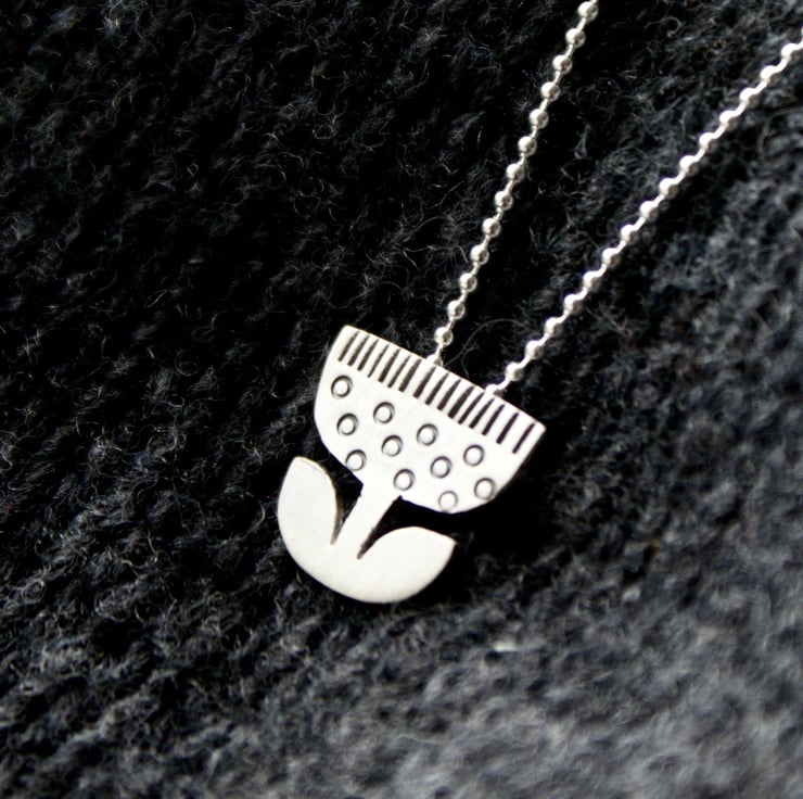 A cute seed head shaped pendant hand cut from sterling silver. The surface has been textured and lightly oxidised with circles and lines.
