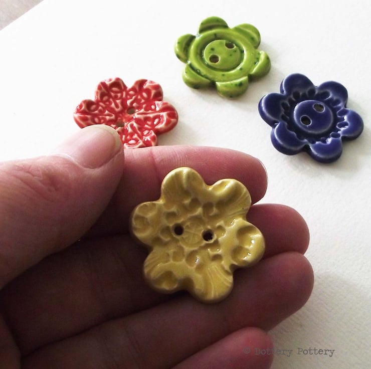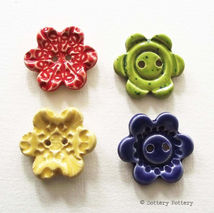 This set of four ceramic buttons are made from white earthenware clay, embossed and glazed to 1100 degrees, so nice and strong.
