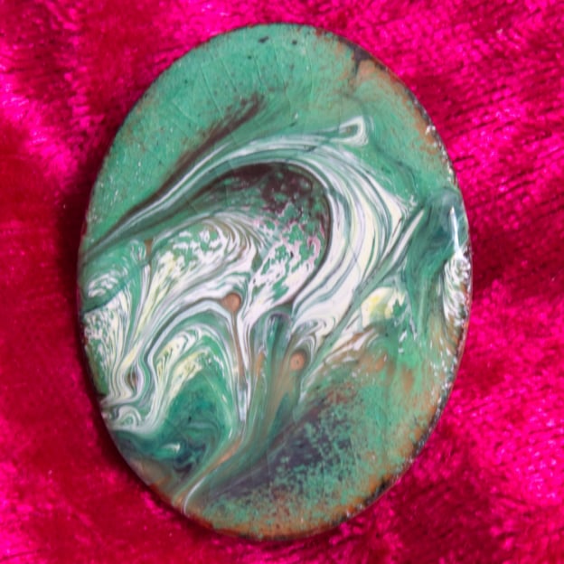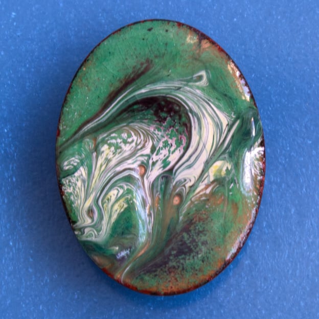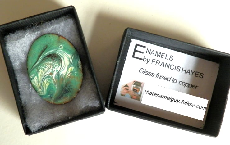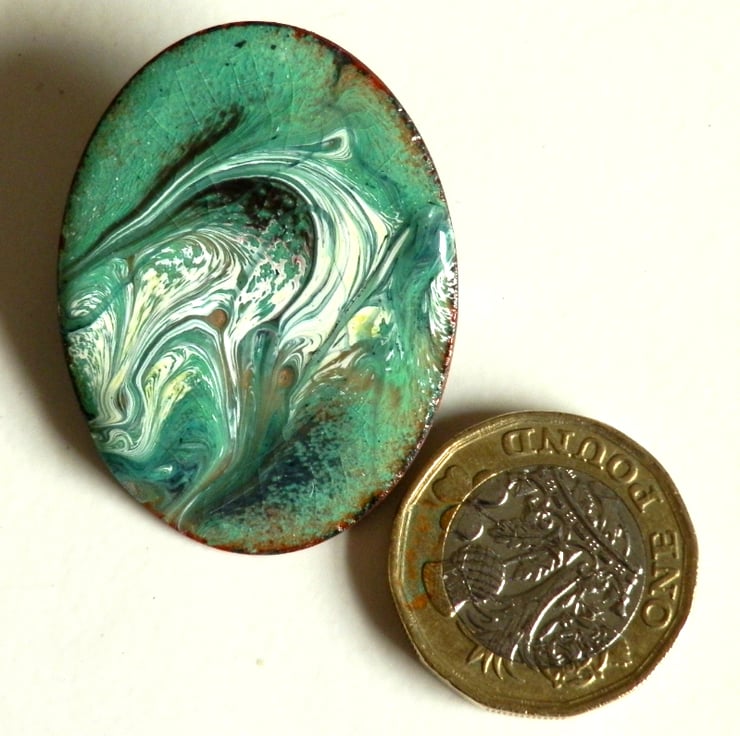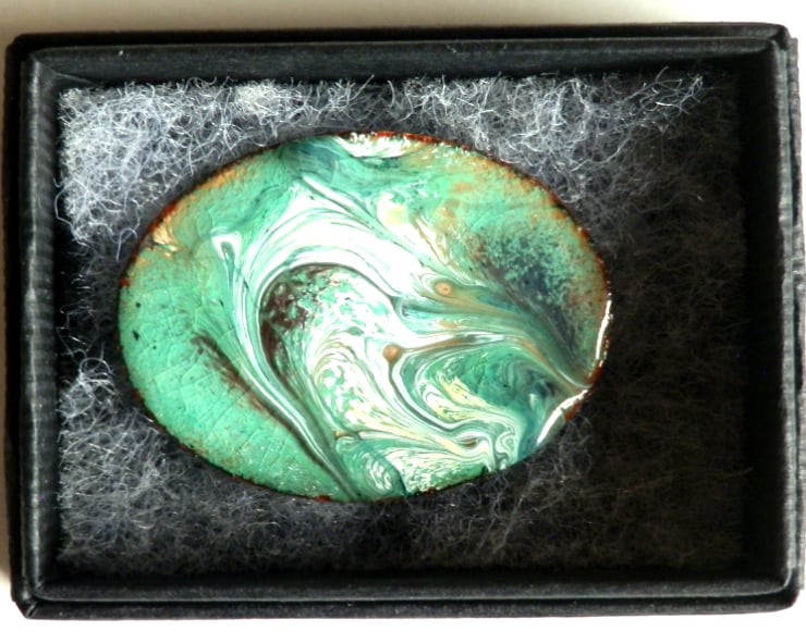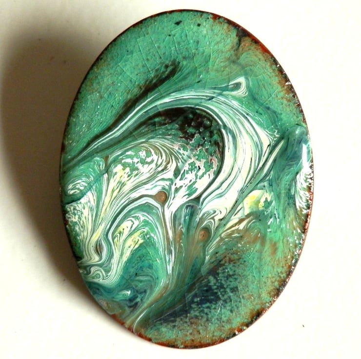 This brooch's copper base shows golden brown, through layers of clear and green enamel. After firing the green layer I scattered white and grey enamels on it and scrolled through these to make the unique, random, scrolled pattern.