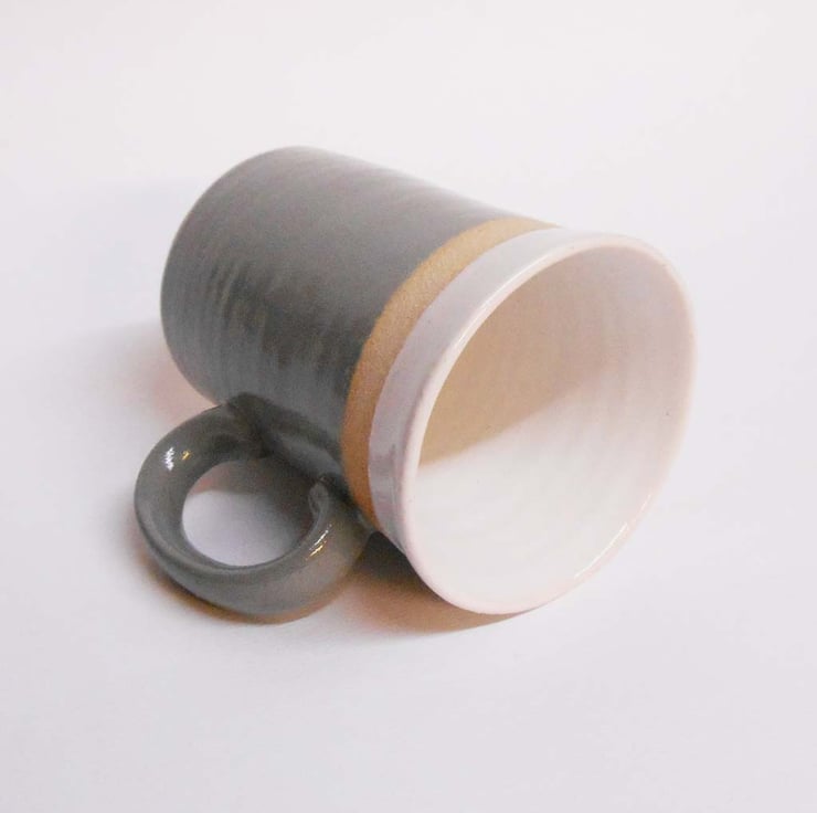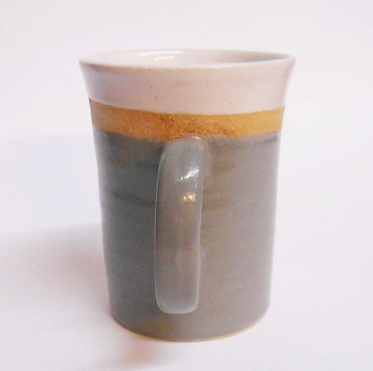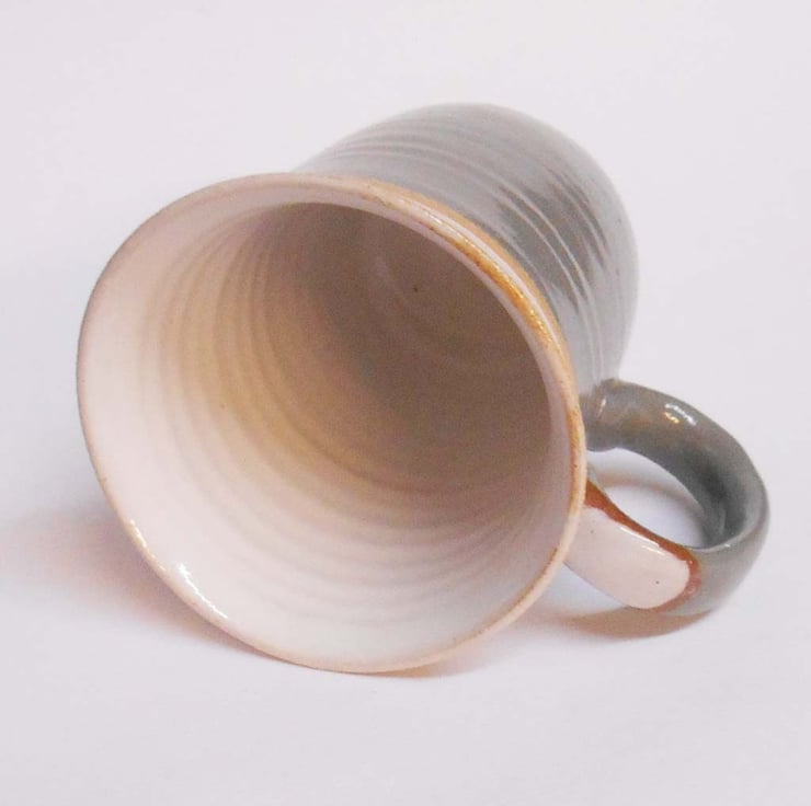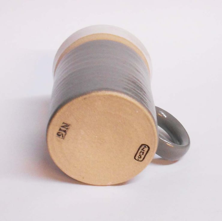 Wheel thrown hand made and painted unique one off item. It is made from durable stoneware clay and glazed with shiny tin white on the interior, and mid grey across the lower part of the mug. My Unique Potters stamp appears on the base. 10 cm high.