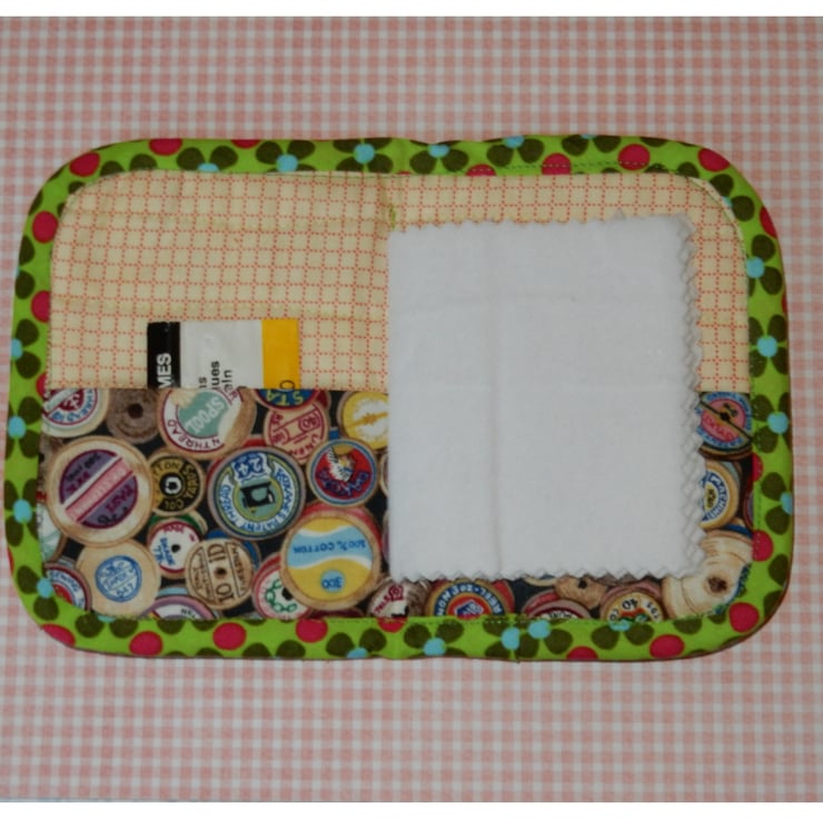 This bright cheerful needle case measures approx 5.5 x4 inches and is made from fabric reading "a passion for patchwork" and featuring cotton reels. It is lined in a pale check fabric and has four flannel leaves for your pins and needles. This needle case also has an inside pocket, made from cotton reel fabric for your pins or needles etc. (not included) It has a matching binding to complement this, and a layer of wadding for added body..An ideal present for the needlewoman, and would be a great present for anyone keen on sewing or for those essential repairs in any household.