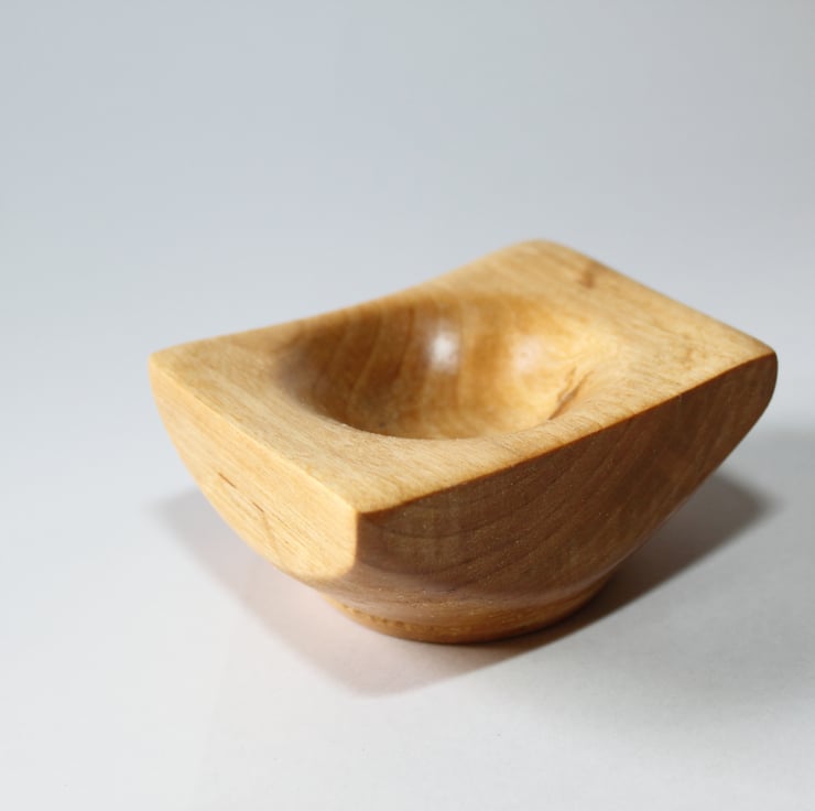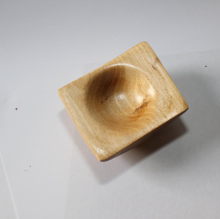 92mm x77mm x 43 mm. 160 Grams weight. A lovely little bowl with square edge so it will easily nestle on a mantle piece, shelf or dressing table, to store those little nick Knacks, usb sticks, keys, butterflies, ear-rings etc.