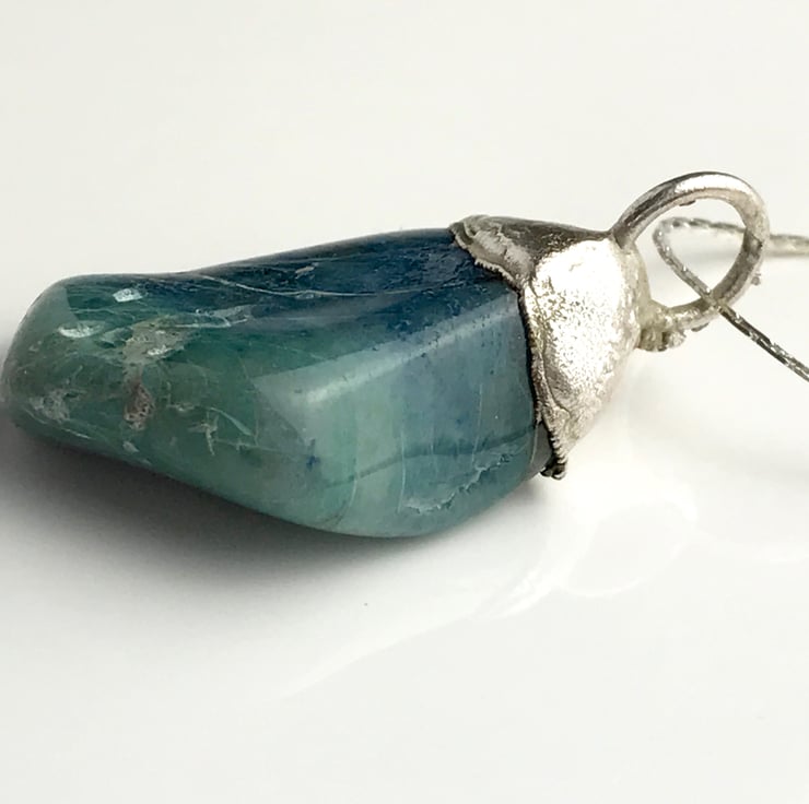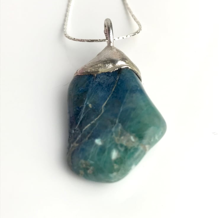 A gorgeous ocean blue-green Chrysocolla semi-precious stone necklace enhances expression and energy.