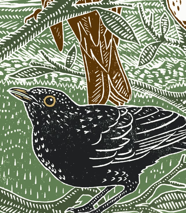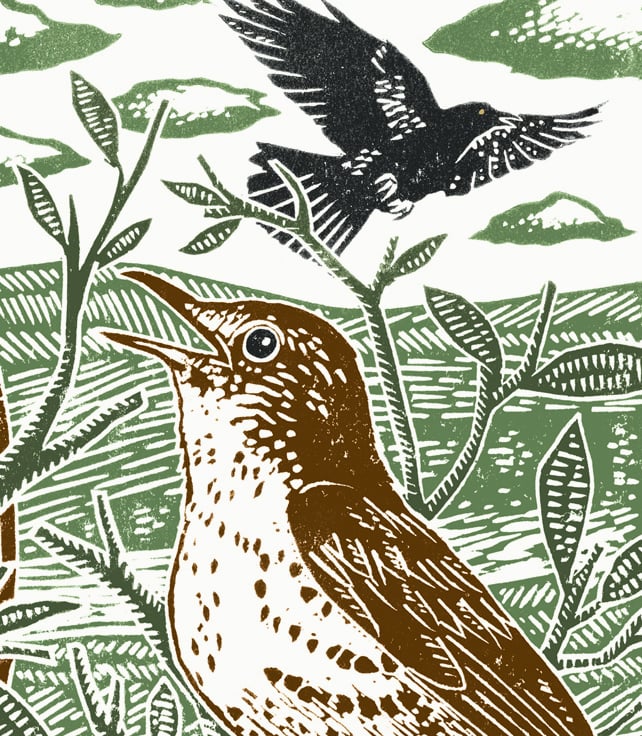 I heard a recording of my favourite folk singer Shirley Collins singing her version of this song a few years ago, and it has forever stuck in my head. It is a beautiful song, and I felt moved to somehow represent it in a linocut print; 'If young men could sing like blackbirds and thrushes, how many young girls would go beating the bushes?'...