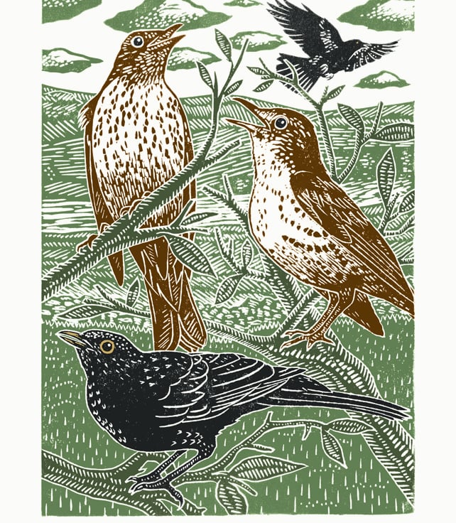 A3 (29.7cm x 42 cm) poster-print entitled 'Blackbirds and Thrushes' printed in green, brown, black and yellow.