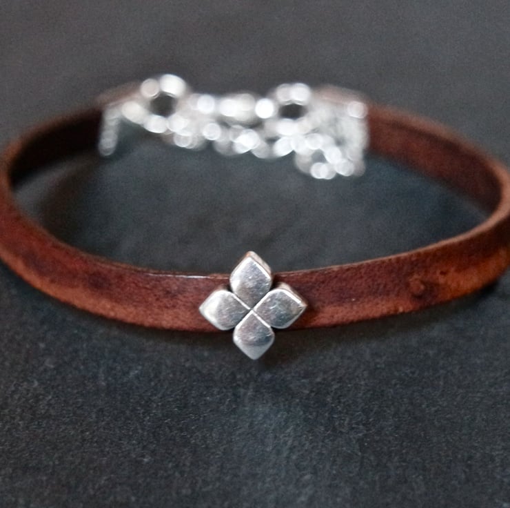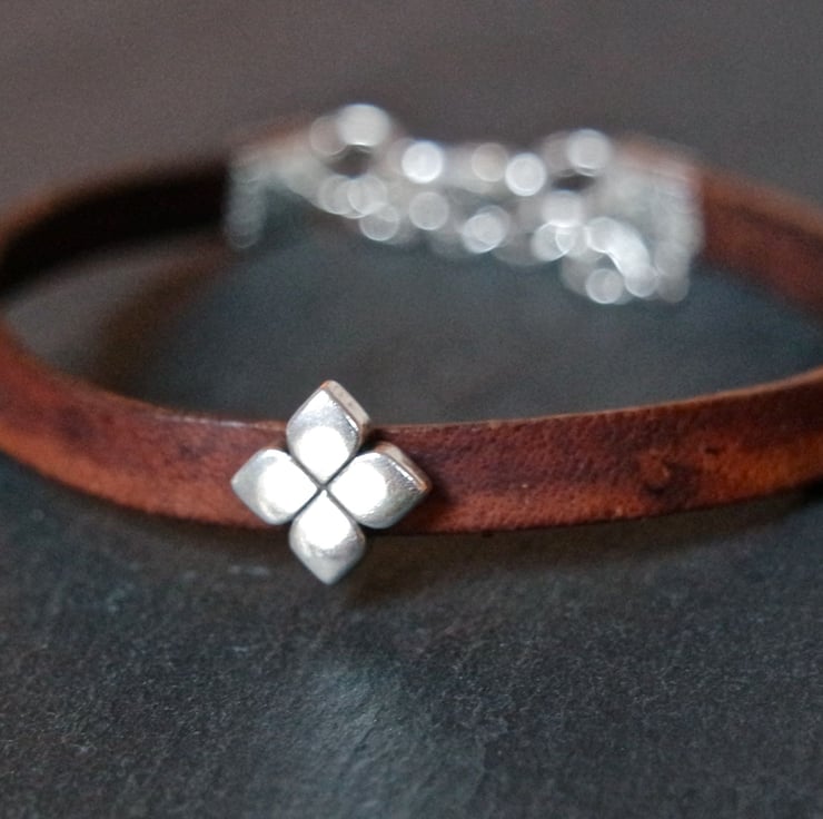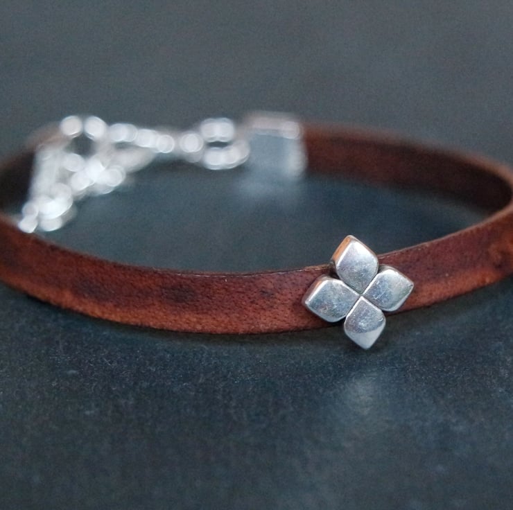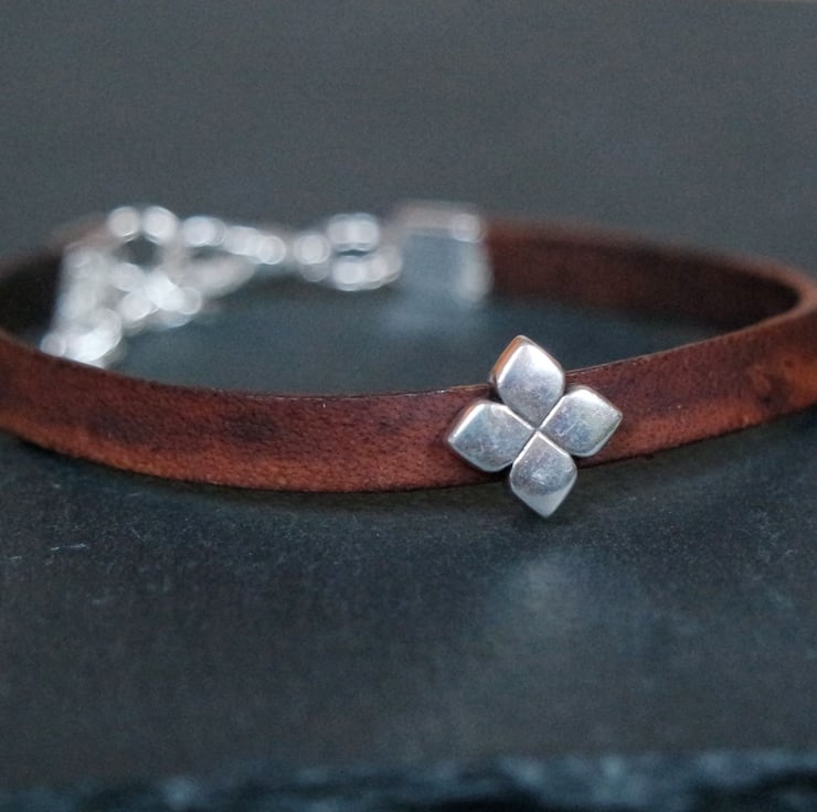 A lovely dark brown leather bracelet with a small floral shaped slider bead in silver.
