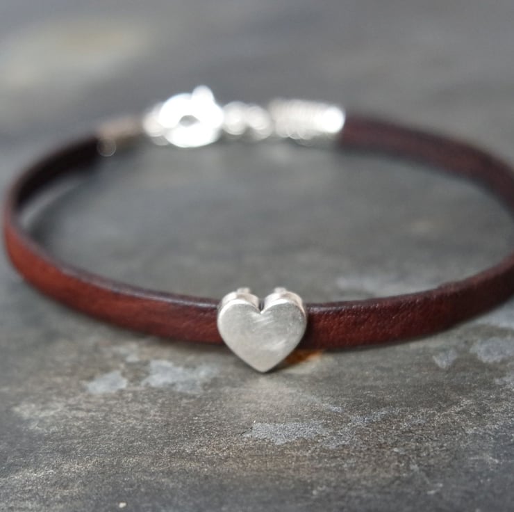 A lovely dark brown leather bracelet with a small heart-shaped slider bead in silver.
