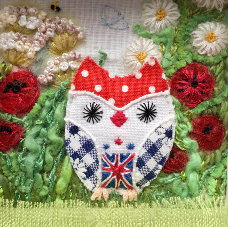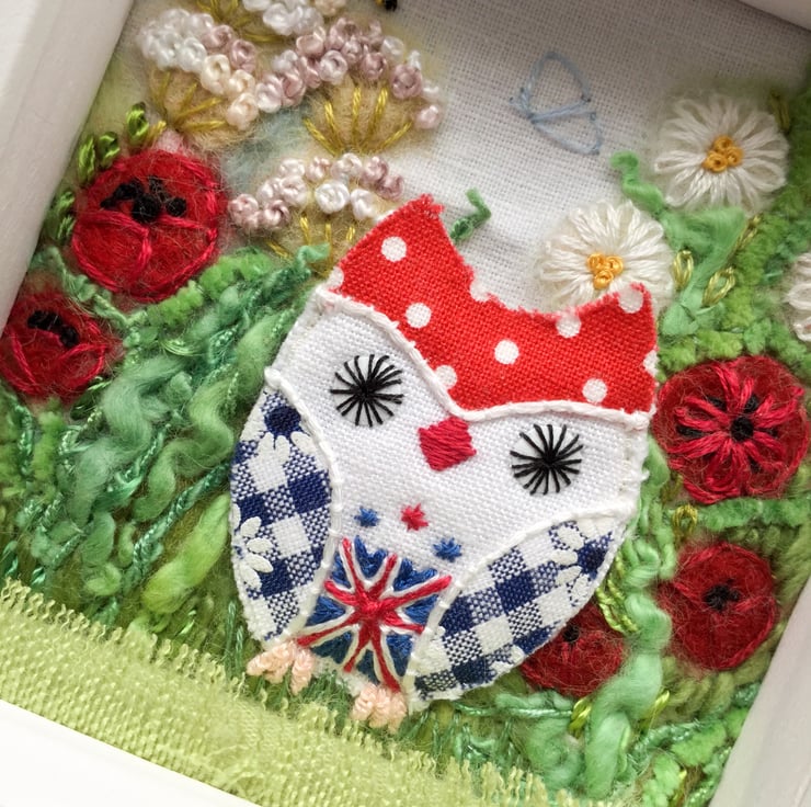 This one of a kind shadow box frame has been made using a variety of techniques, needle felting and hand embroidery have made this miniature cottage garden where Betty the tiny patriotic owl lives. Betty has been appliqued, padded, embroidered with sequins for eyes and a Union Jack has been stitched onto her tum! A lovely quirky design, ideal for a bird lover or gardener.