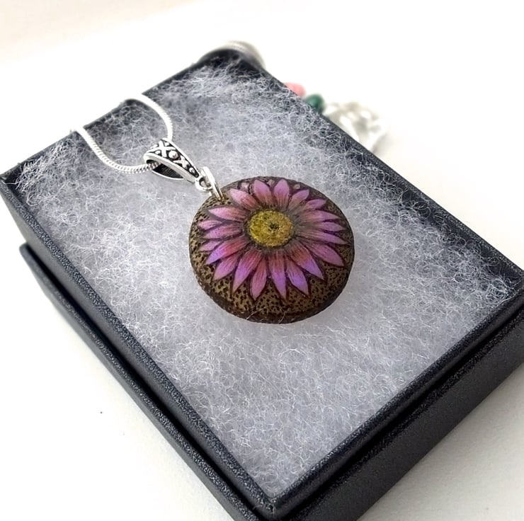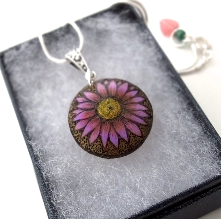 A lovely dainty flower on a tiny pendant made from wood. The design is burned into the disc using pyrography and then subtly coloured using prismacolor pencils and posca inks.