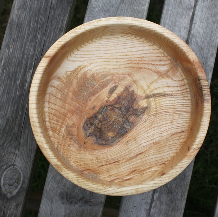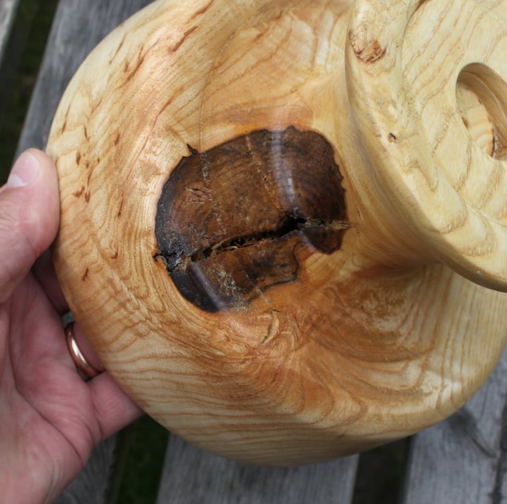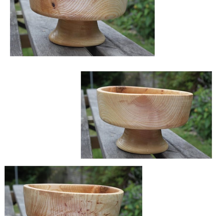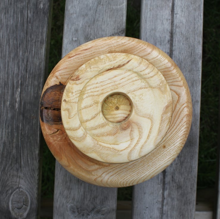 Bowl 15) 197mm diameter x 122mm high x 112mm diameter at base with a 30mm deep bowl at the top Ash (Note, it wasn’t quite seasoned when I turned it a few years ago and has moved after turning, hence wobble in the rim and split in the knot underneath. which adds to its unique, handmade feel.1005 grams weight