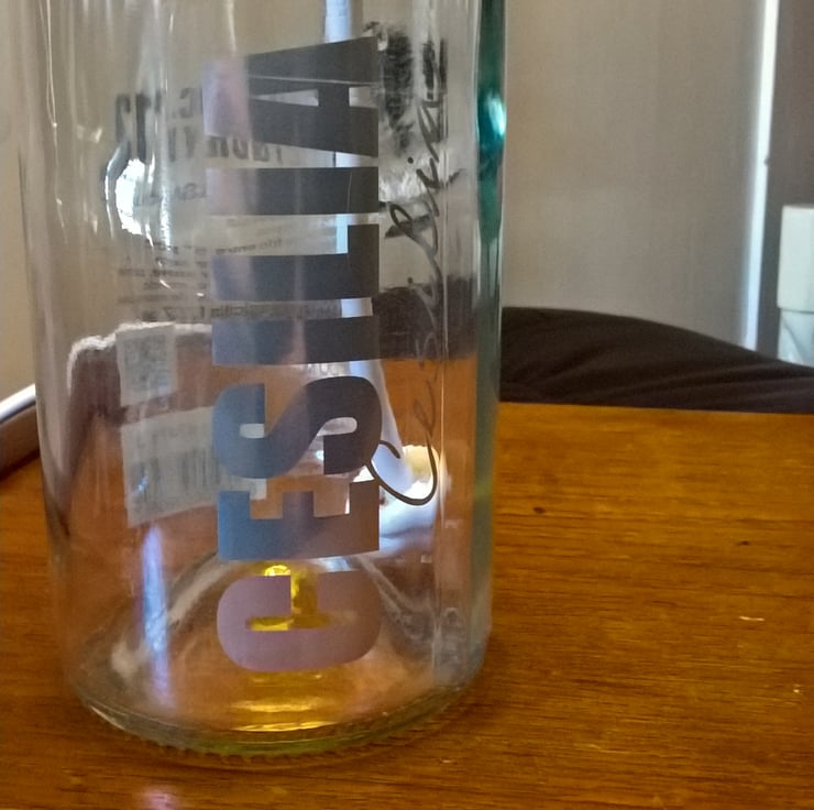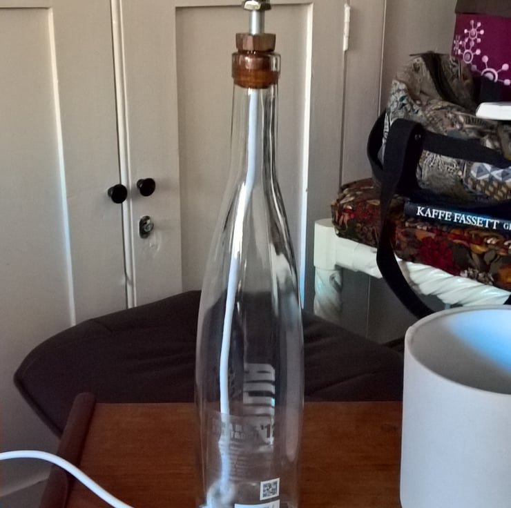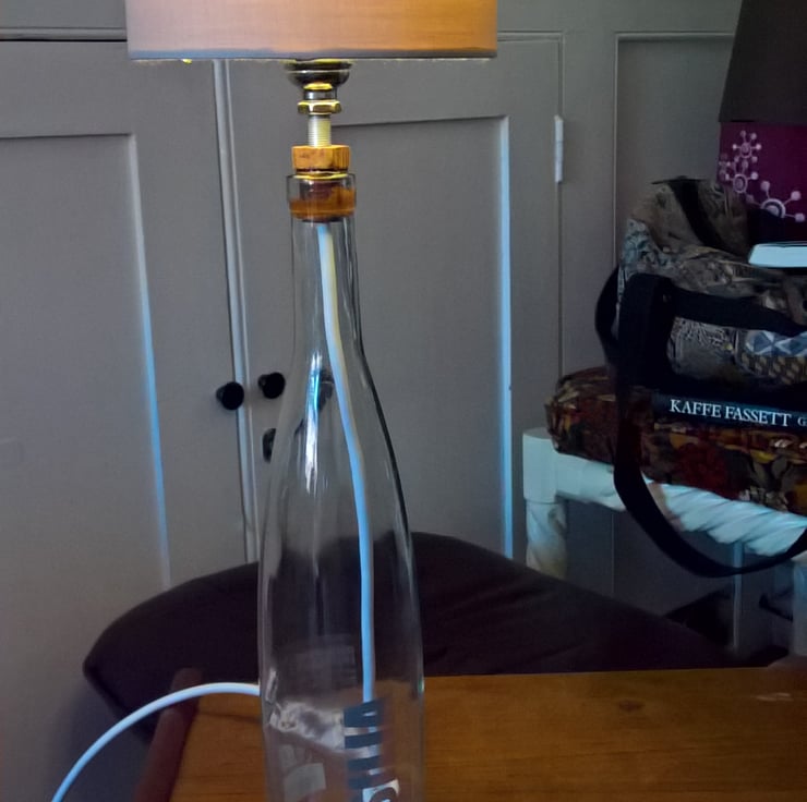 White wine bottle pop art lamp shade. We went for a dy trip to Brighton and my daughter saw some in a shop and asked me to make some for her. She chose her favourites for her university digs and I'm offering the rest for sale. She keeps them firmly attached to her mantle piece using blue tack underneath and has a shade so if they do get knoocked off it stops the bulb from breaking. Nice pop art table lamps, bit of fun and good recycling.