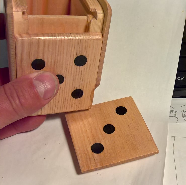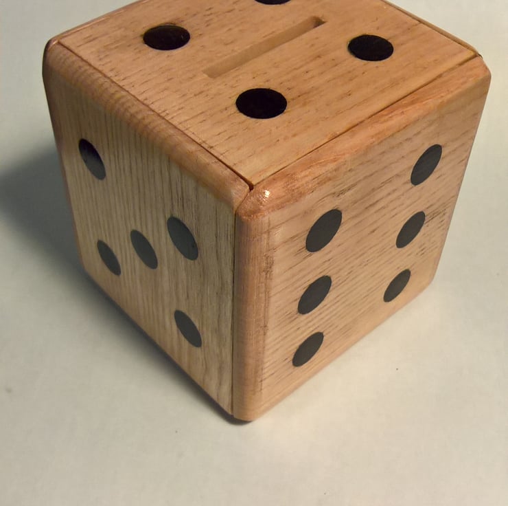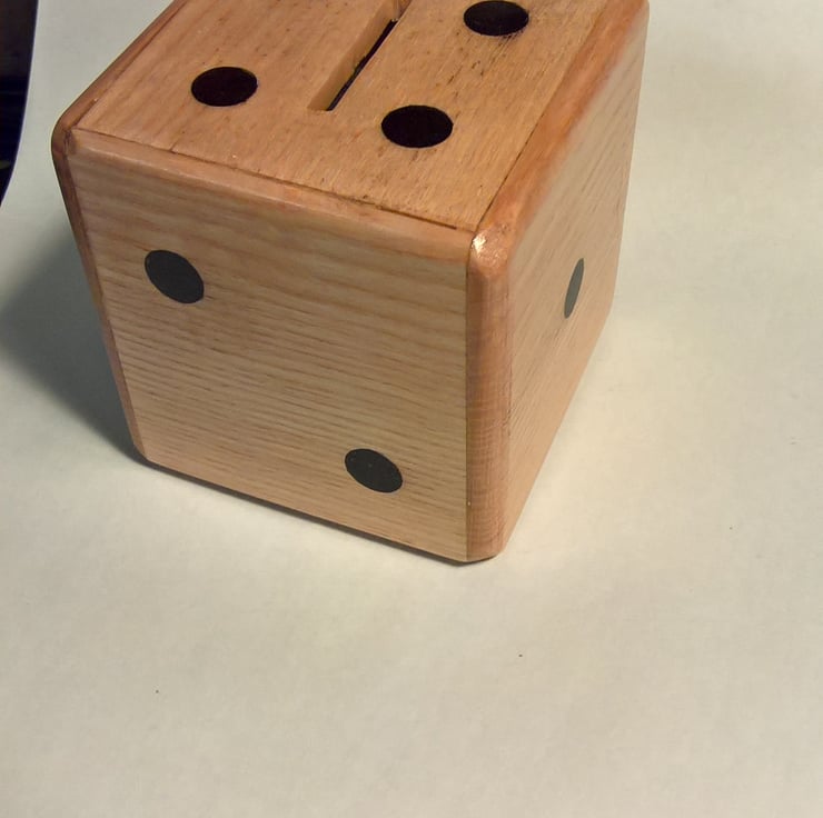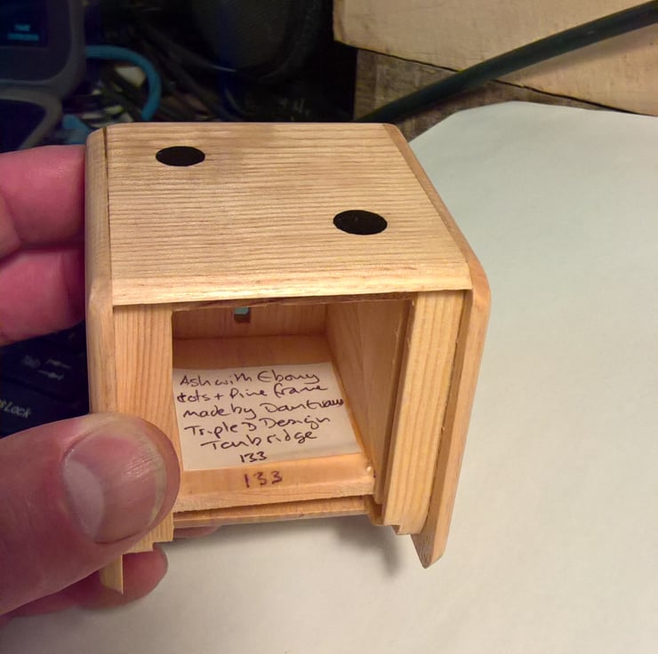 Money box, Ash with ebony dots and a pine frame inside, with two doors that slide to allow the money to be "gotten out" and a slot wide enough for a two pound coin. The money box is approx. 67 x67 x 67mm, with two side that slide out to allow the removal of coins. It has a pine frame and is finished with a melamine lacquer made by chestnut product which states it is safe for toys. A shop in Rochester, High Street Kindly sold them every Christmas for a few years, but it is a long way to travel, so I thought I'd try them on a web shop... hope you like them! (I have a few other styles and colours so shout if you want me to put some more on the web shop)
