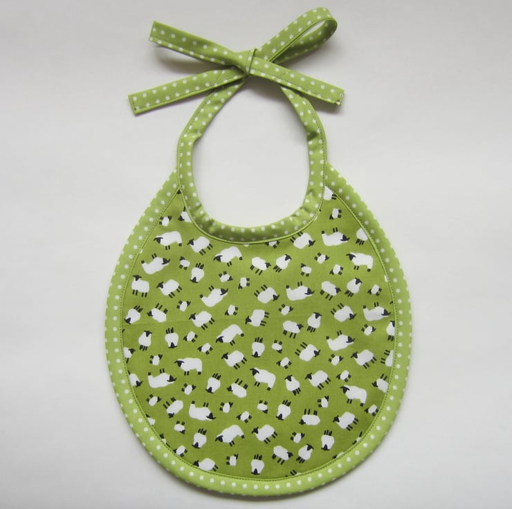 First size babies bib in sweet sheep and lamb print. Edged with lime green and white spotty bias binding and backed with white towelling.