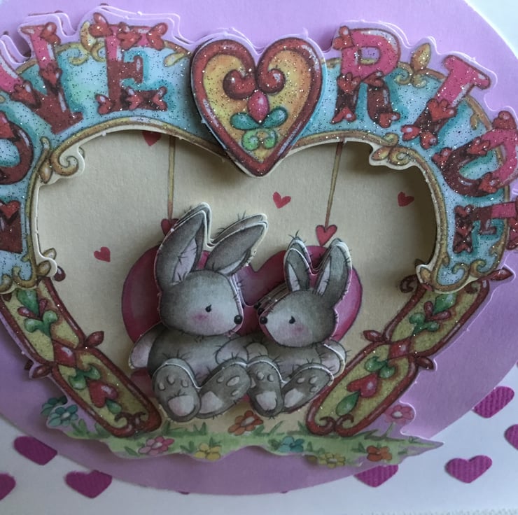 This lovely decoupage card has two bunnies, so in love, riding on the love ride.