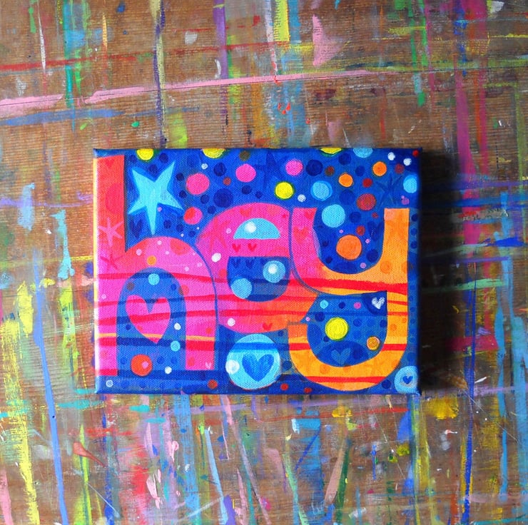 Original canvas painting by illustrator Jo Brown from a series of word paintings, decorated with lovely patterns in pink and and orange and blue -hearts and spots and stripes. shallow canvas with d-ring on back for hanging, or will just balance on a nail. size approx 6 x 8 inches.