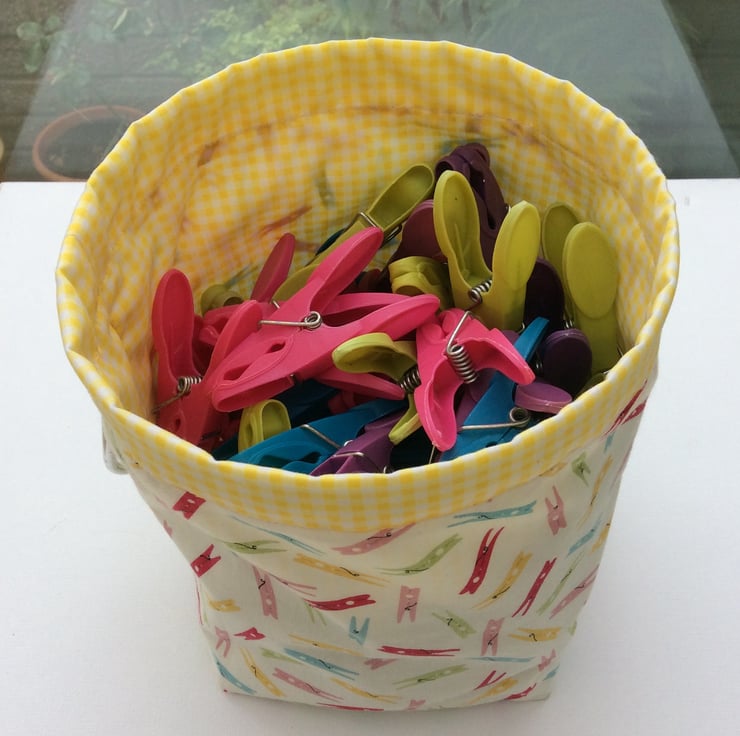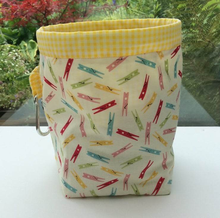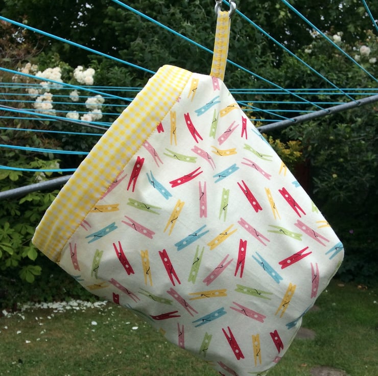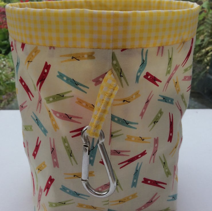 Brightly coloured pegs on a cream background with a yellow and white gingham lining. This hanging or free standing peg bag measures approximately 20cm deep x 16.5cm in diameter. When not free standing an aluminium carabiner hook allows it to be hung from your washing line or your belt loop. Plastic banding threaded through the rim holds the bag open for easy access to pegs.