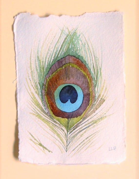 An original watercolour observational painting of a peacock feather. Painted in artists quality watercolour on a beautiful piece of deckle edged textured paper made by Khadi. The size is approximately 11x15cm - 6x4inch (approx size due to the uneven deckle edge). The painting is signed in pencil in the lower right corner.