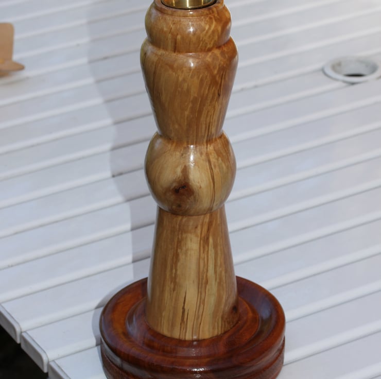 Spalted Pear with Columbian Kingswood base Candle Holder. The base is 122mm diameter, 33mm high. Overall it is 263mm tall and weighs 642 grams. The pear was from a tree in my garden that I pruned, then seasoned in a wood pile where it got a beautiful spalted colour, that really needs to be seen to be appreciated. The top is a solid brass fitting. The base has a series of diagonal lines cut into a band (using a special tool from crown tools).